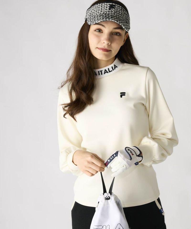 ジャガードのリブ衿がポイントのモックネックシャツ。袖口をふんわりさせたフェミニンなデザイン。裏面がベロア調の柔らかく肌触りの良いストレッチ素材を使用。袖口のボリュームは程よいボリューム感なので、インナーとしてもご利用いただけます。
