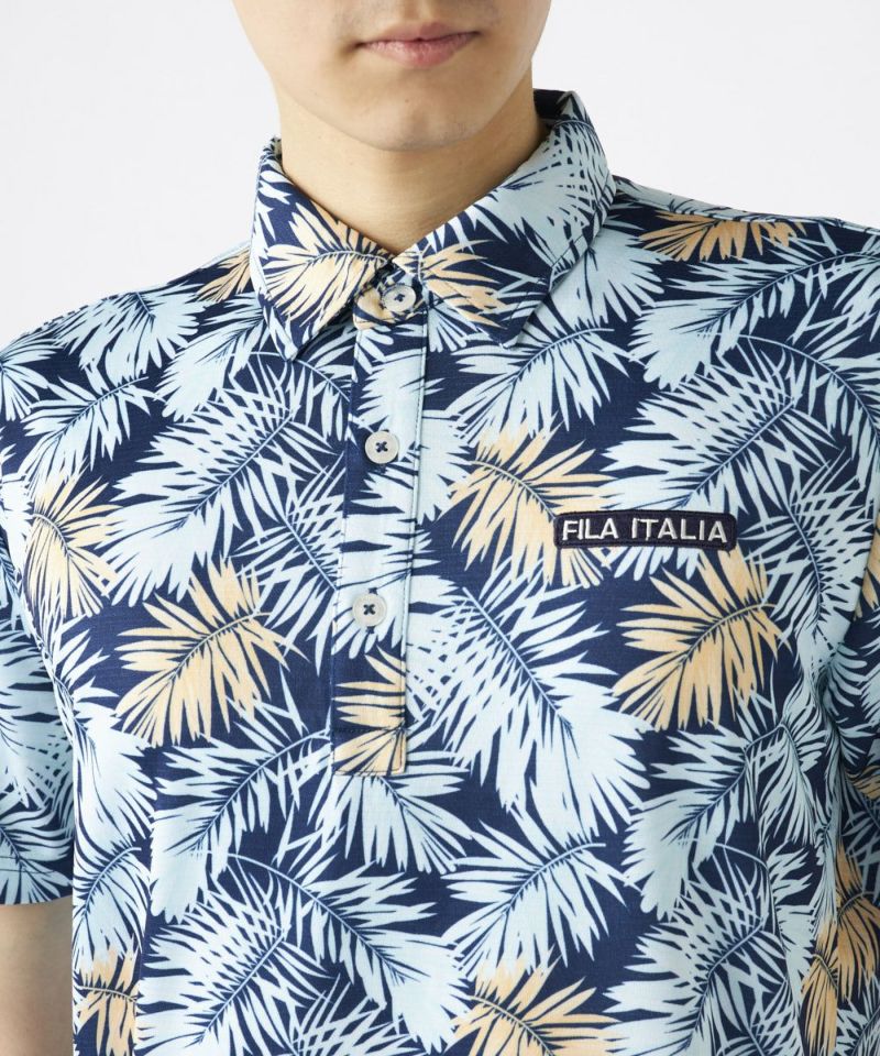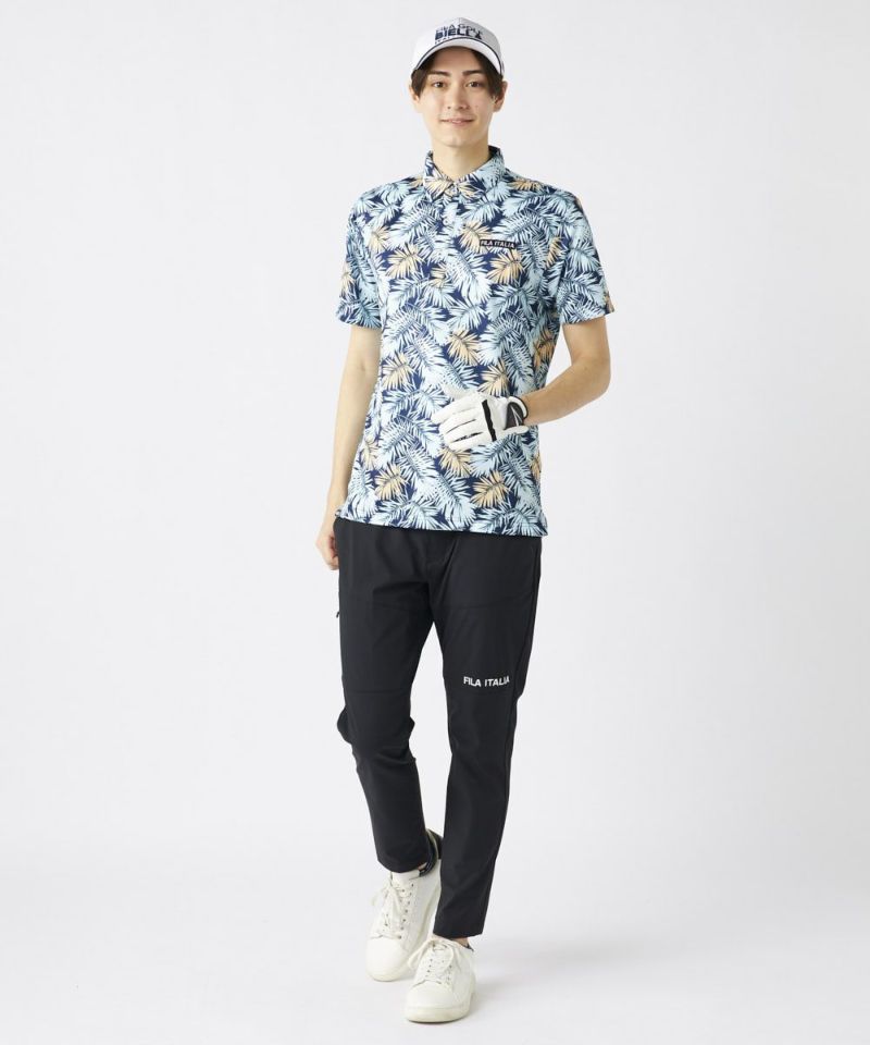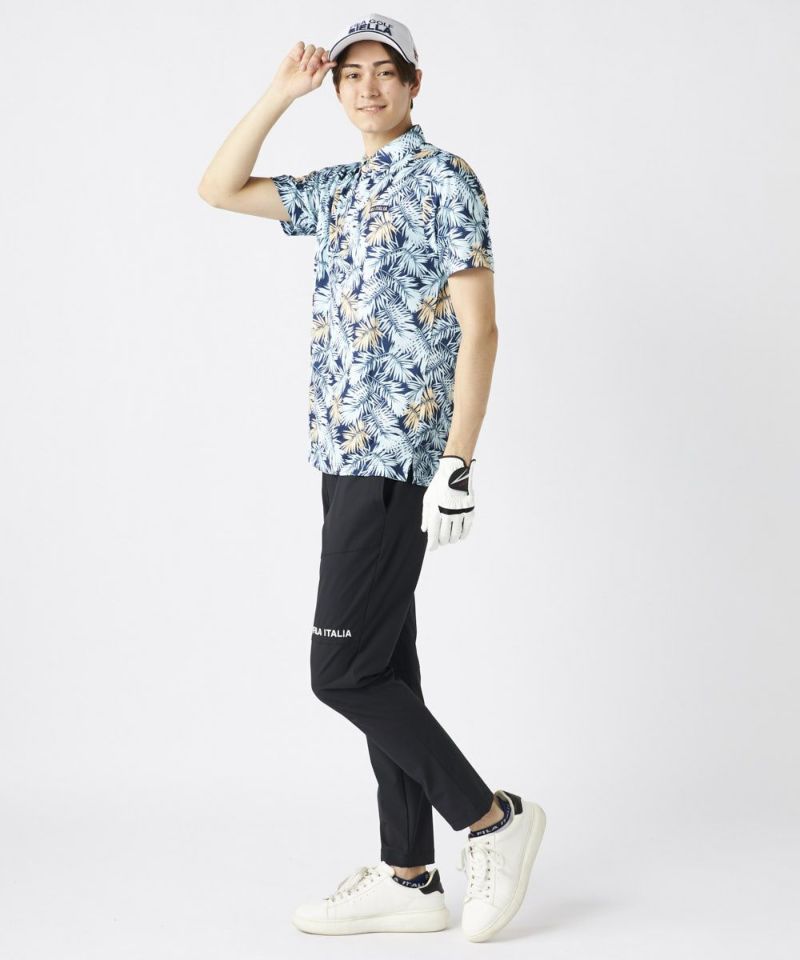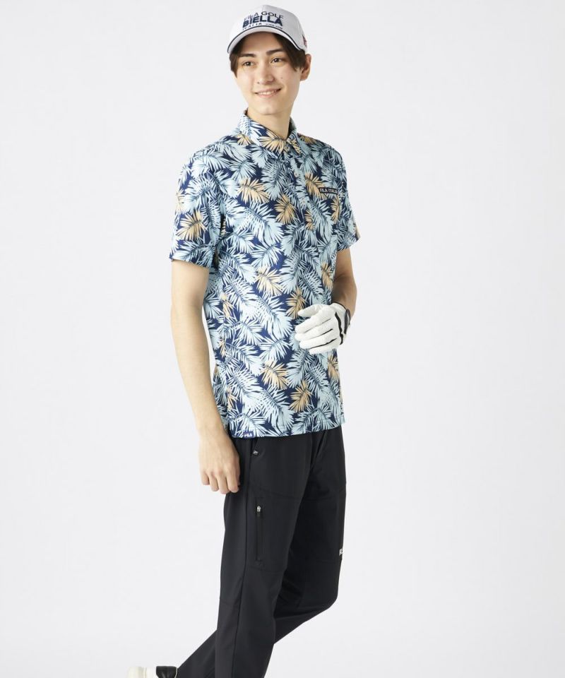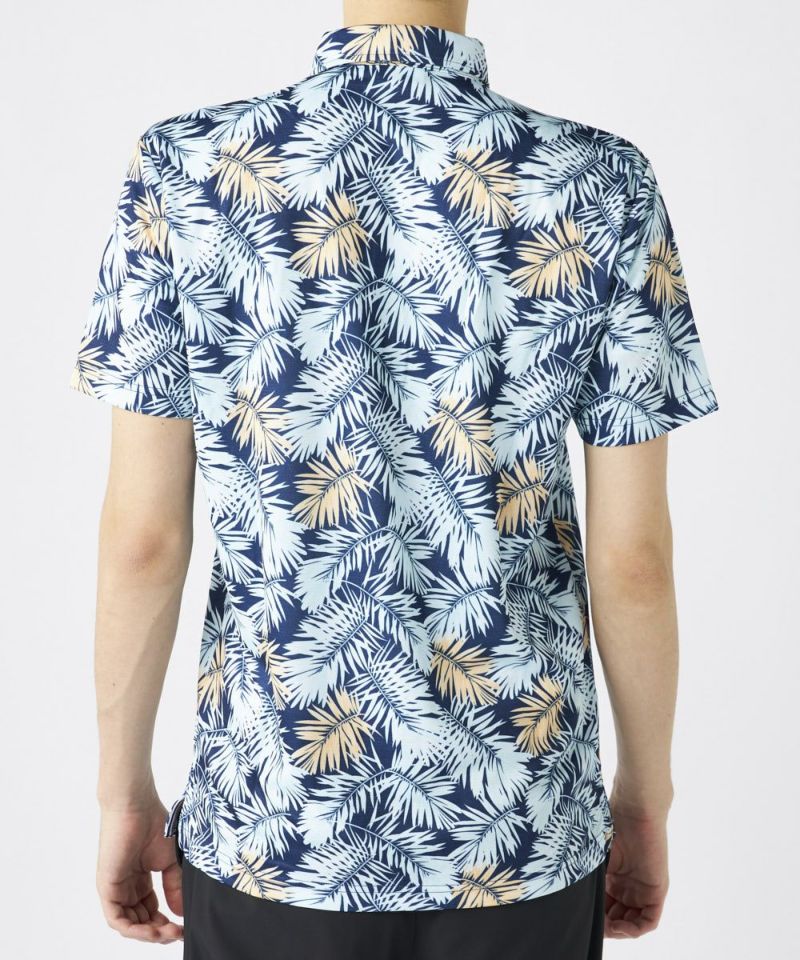 配色がおしゃれなリーフ柄のポロシャツ。シンプルに無地のショートパンツで合わせるのがおすすめです!ハットやサングラスと合わせてより夏らしいスタイリングも◎