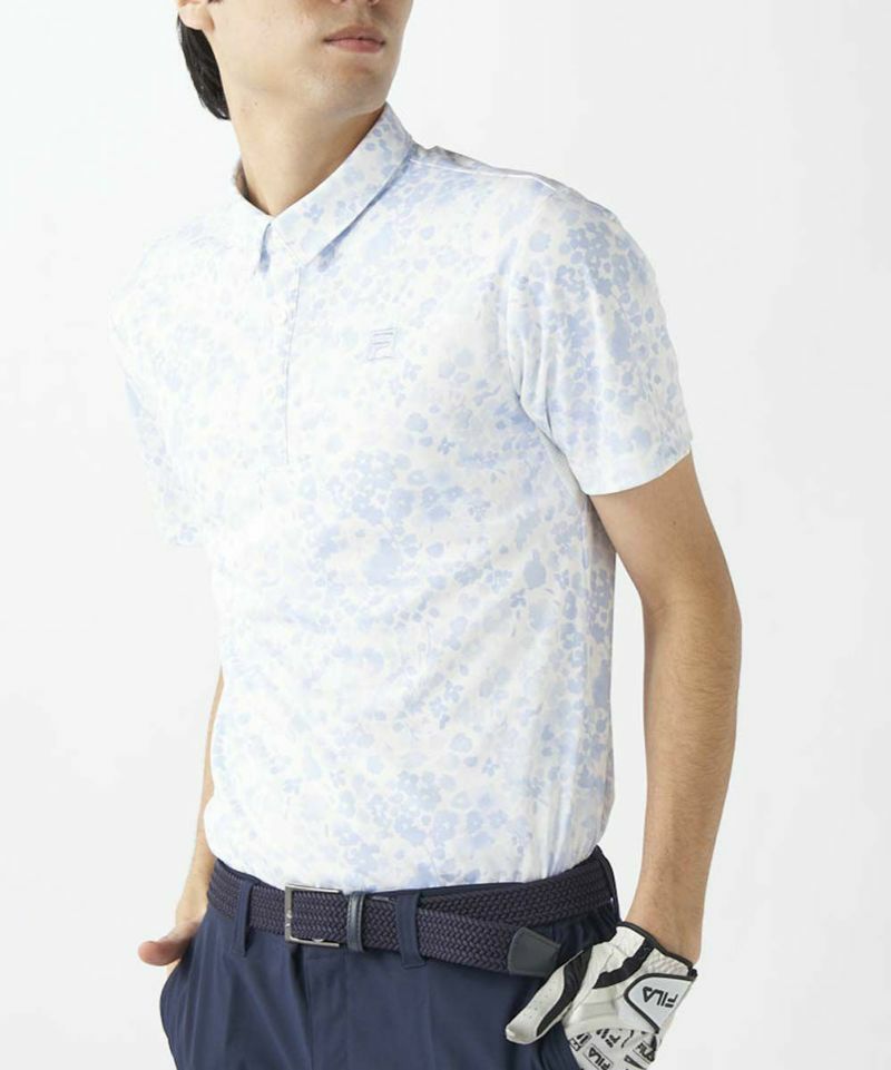 ぼかし花柄がおしゃれな半袖シャツ。吸汗速乾素材で、汗をかいてもさらっとしていて着やすいポロシャツです。シンプルなパンツとの相性がよく、コーディネートの幅も広がります。おしゃれな柄なので、ゴルフ場でも映える一枚です!