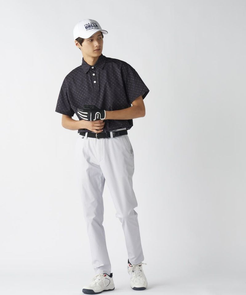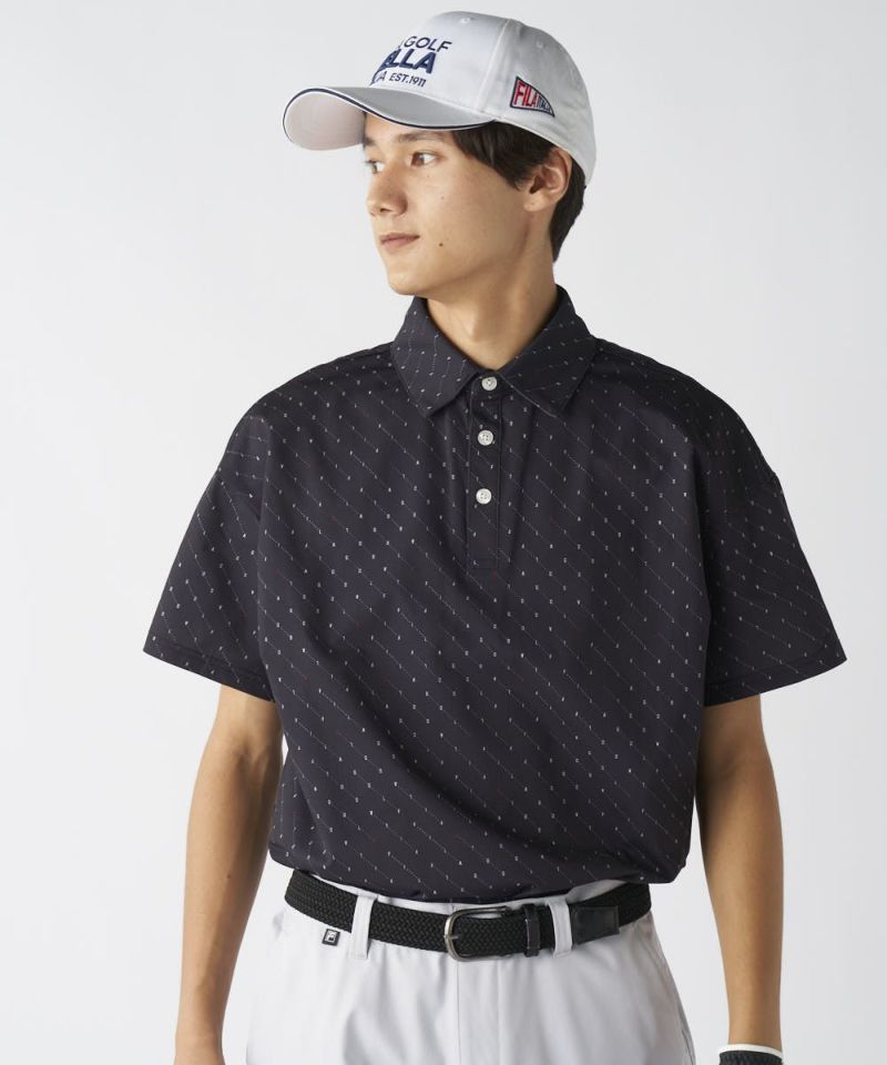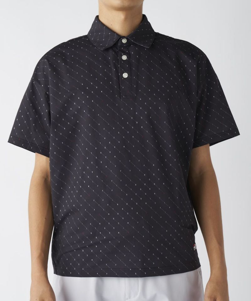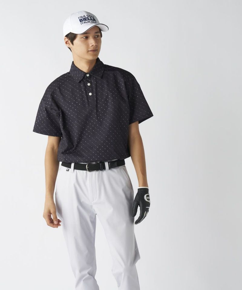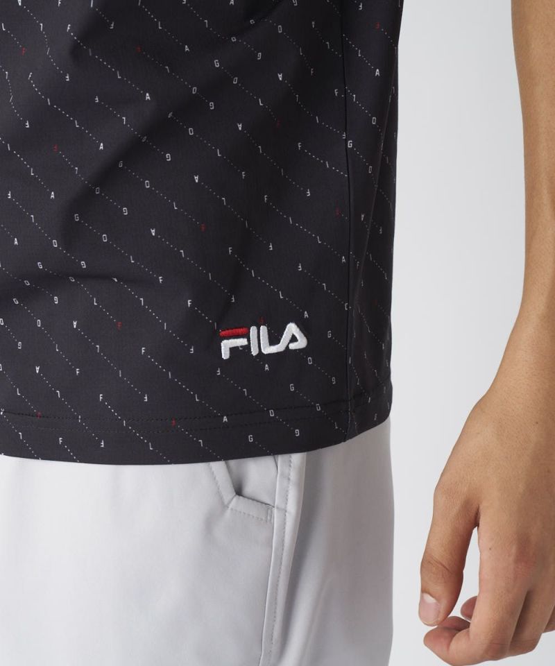 ドットのような配列でさりげなく「FILA GOLF」のロゴをちりばめたおしゃれなデザインの半袖ポロシャツ。アウトでも着やすいよう、裾部分はスッキリとしたデザインにし、FILA の刺繍ロゴもデザインしました。