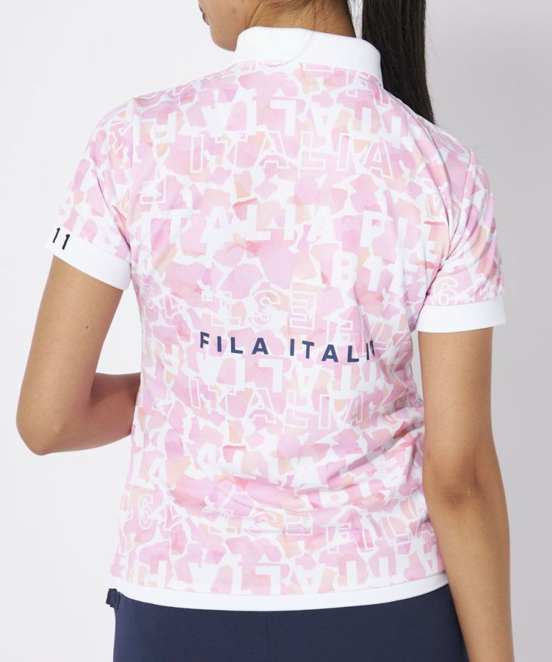 春らしい色合いのモザイクにタイポ柄を重ねたプリント柄のシャツ。裾口リブ仕様のオーバーブラウスタイプ。吸汗速乾、UV、遮熱や接触冷感など、機能たっぷり素材を使用。