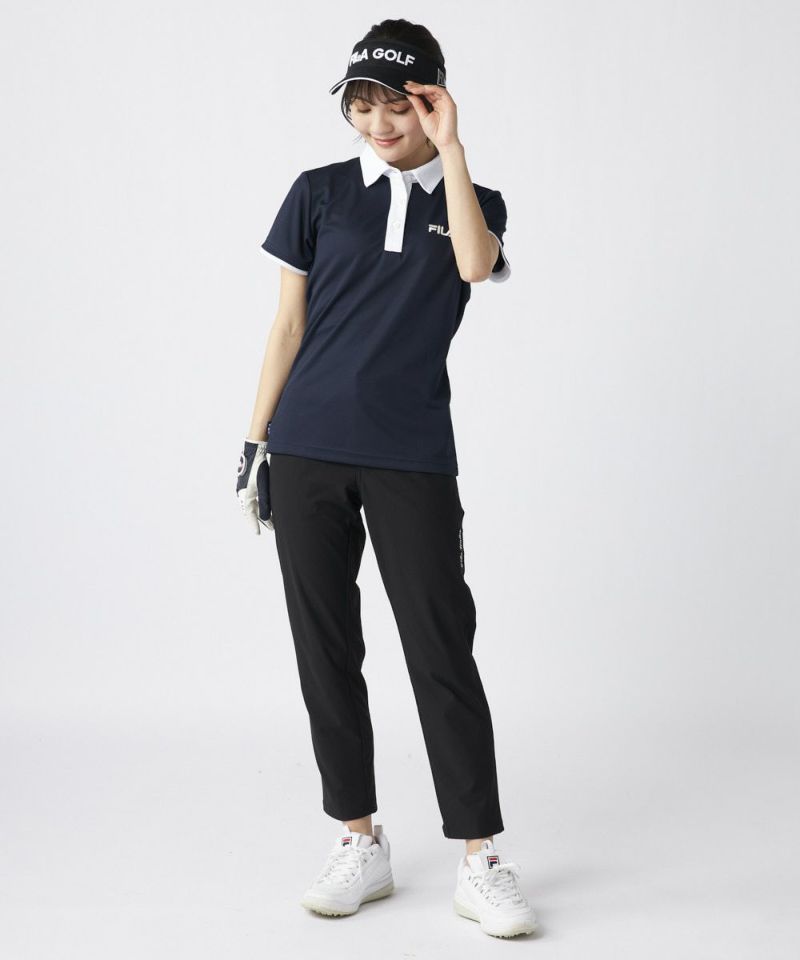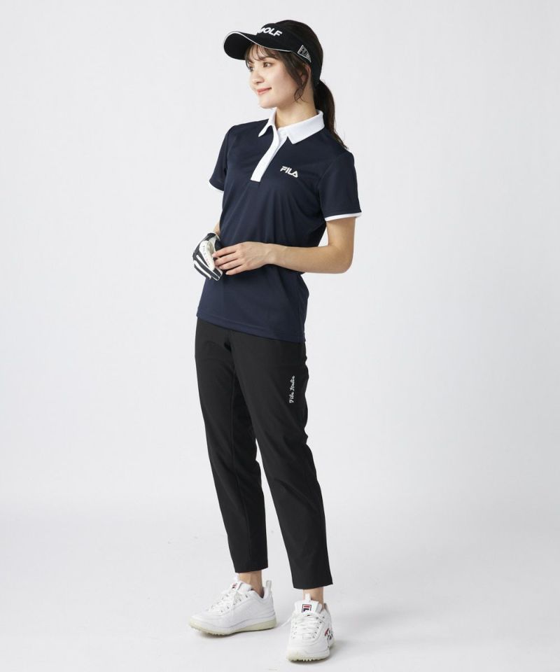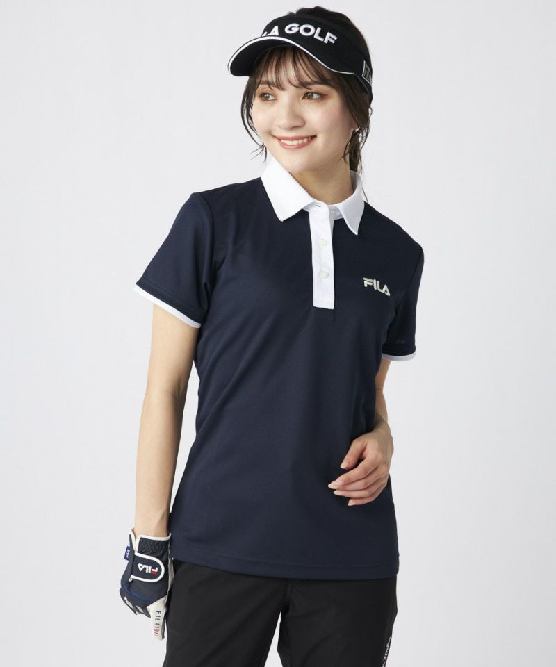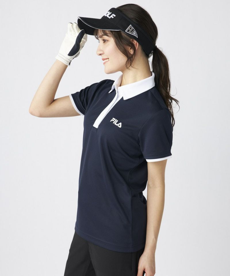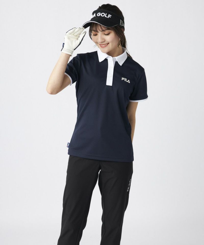 衿のバイカラーがかわいい半袖ポロシャツ。ベーシックなデザインなので、スカート、パンツ選ばずコーディネートを楽しめます。程よい丈感で、アウトでもインでもバランスよく着用いただけます。バックデザインにはフィラゴルフのキャッチコピー【Fun Golf】のテキストを小さく入れており、細部までこだわったオシャレなデザインです。