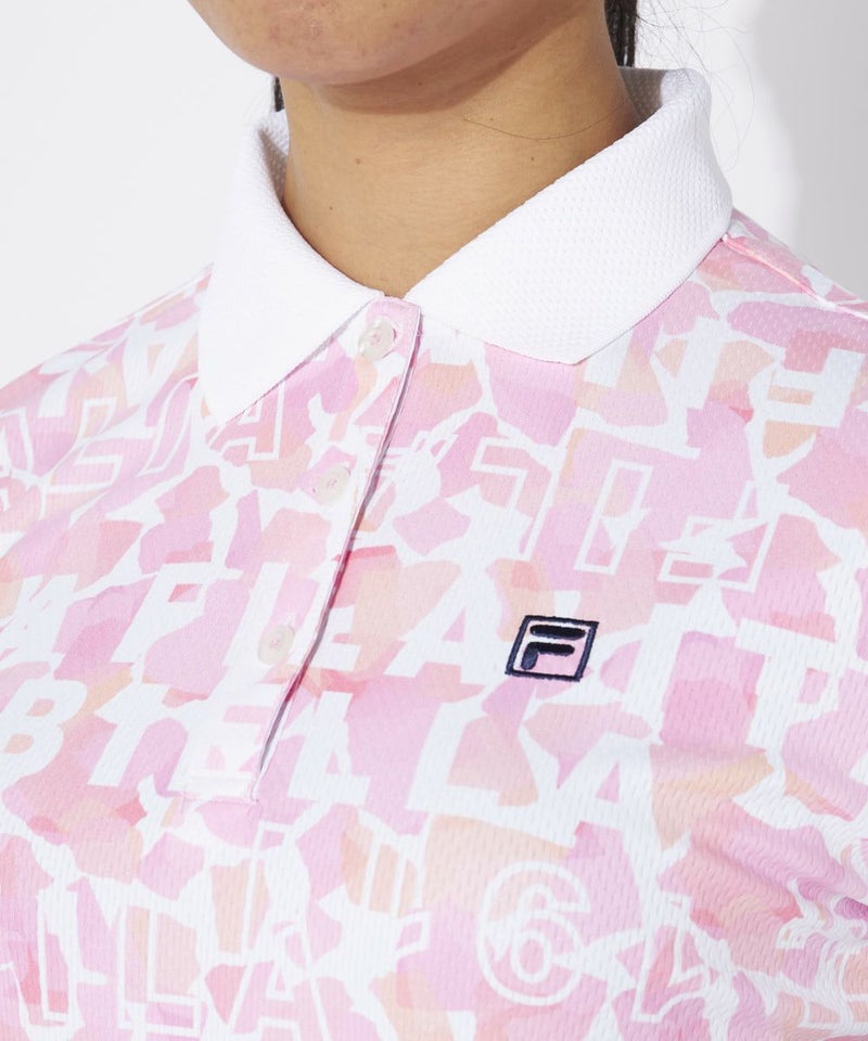 春らしい色合いのモザイクにタイポ柄を重ねたプリント柄のシャツ。裾口リブ仕様のオーバーブラウスタイプ。吸汗速乾、UV、遮熱や接触冷感など、機能たっぷり素材を使用。