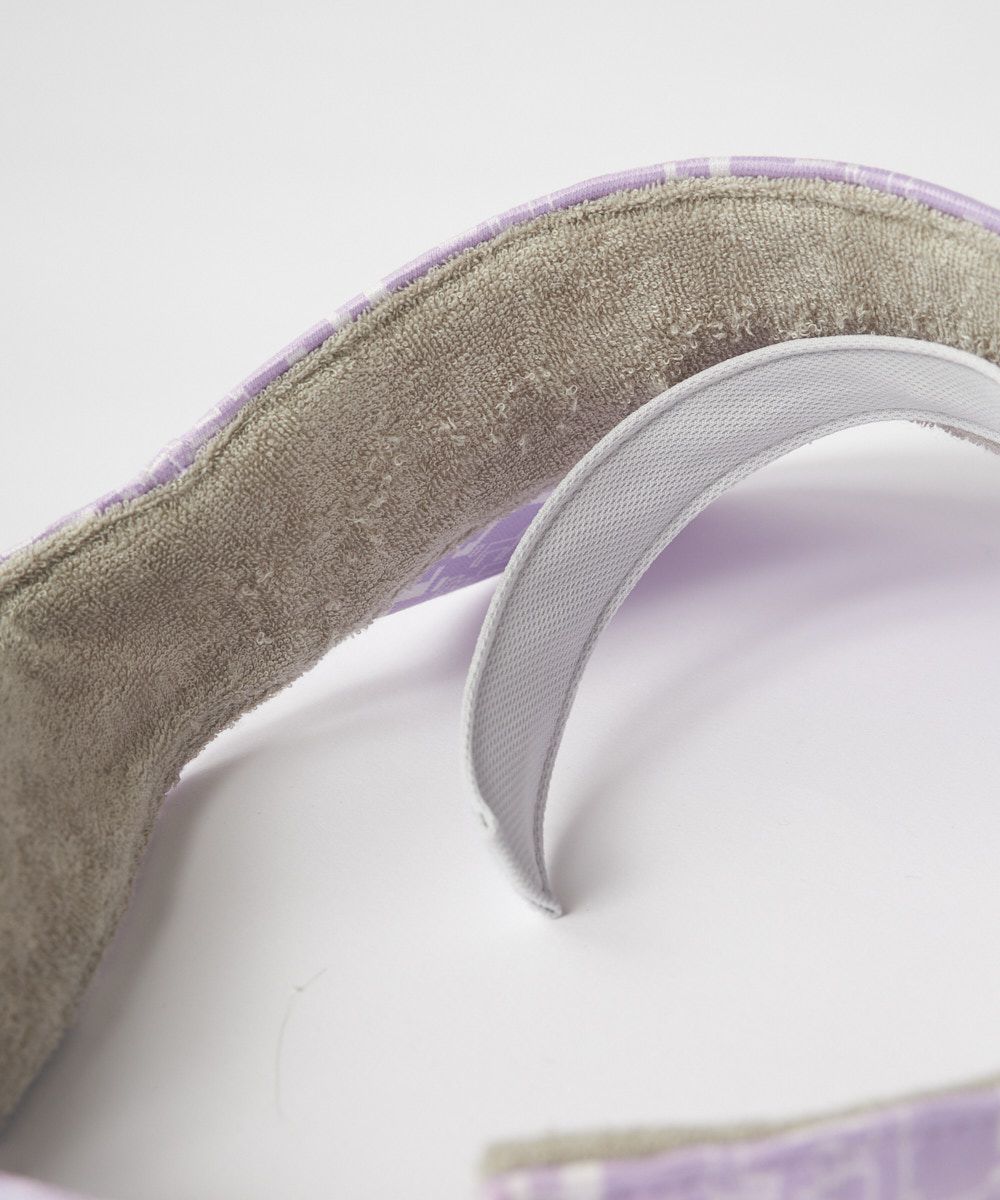 デジタルフォントのタイポ柄がおしゃれなサンバイザー。ボタンで取り外せるジョーゼット素材のリボンがアクセント。