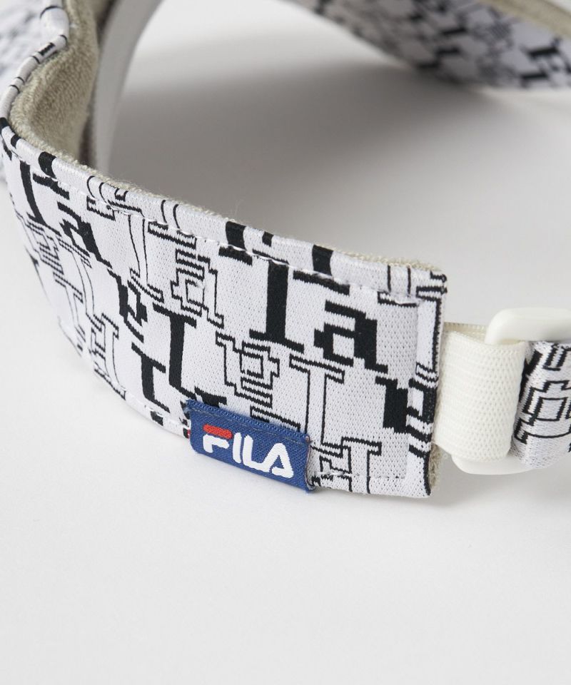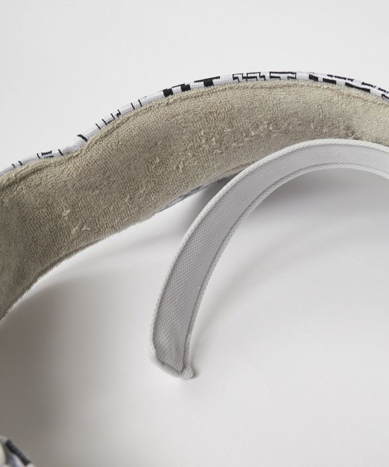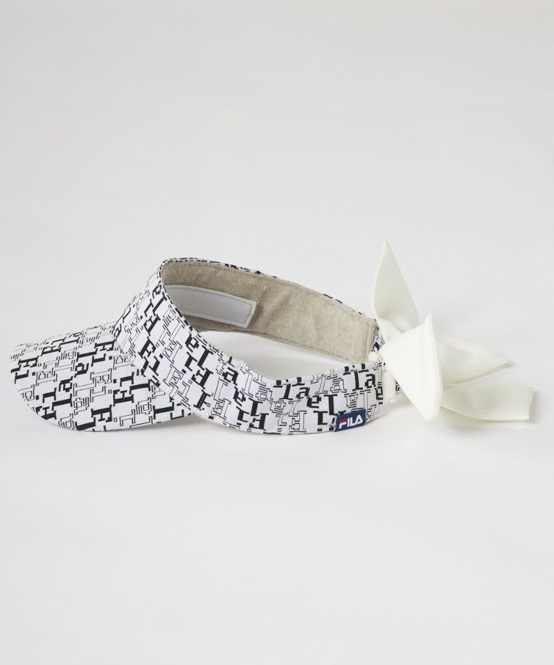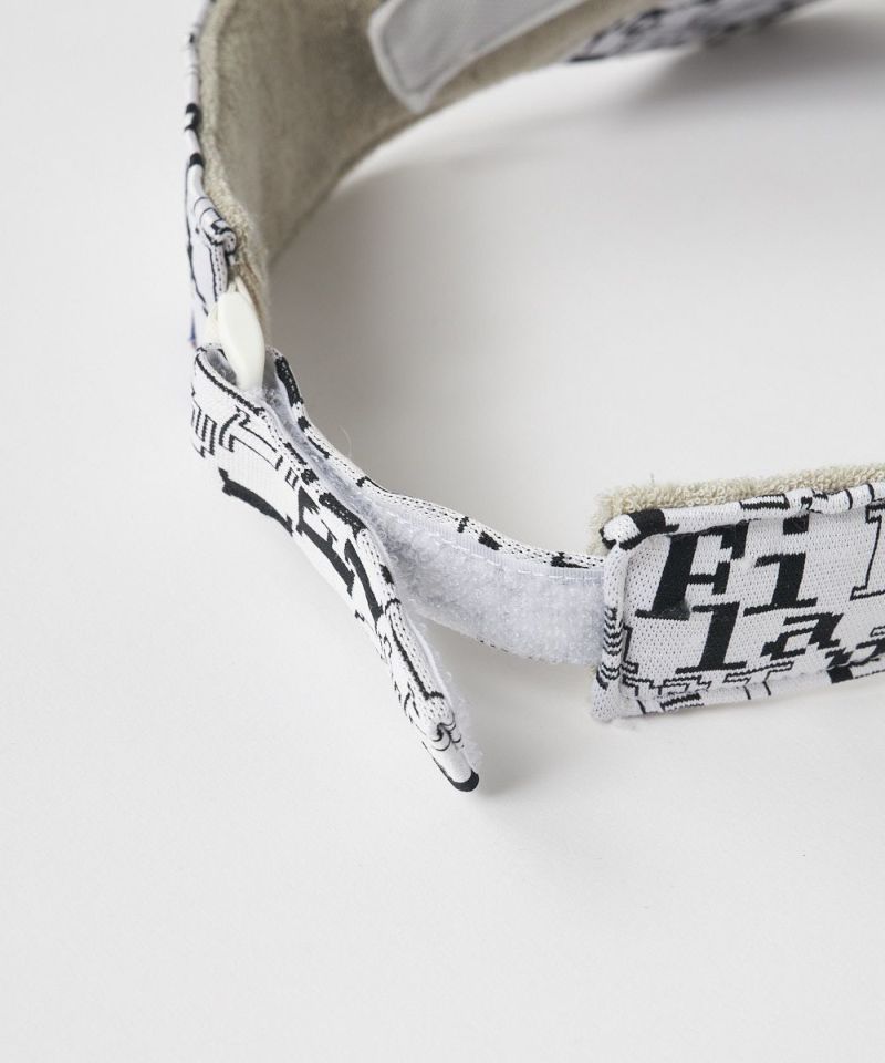デジタルフォントのタイポ柄がおしゃれなサンバイザー。ボタンで取り外せるジョーゼット素材のリボンがアクセント。