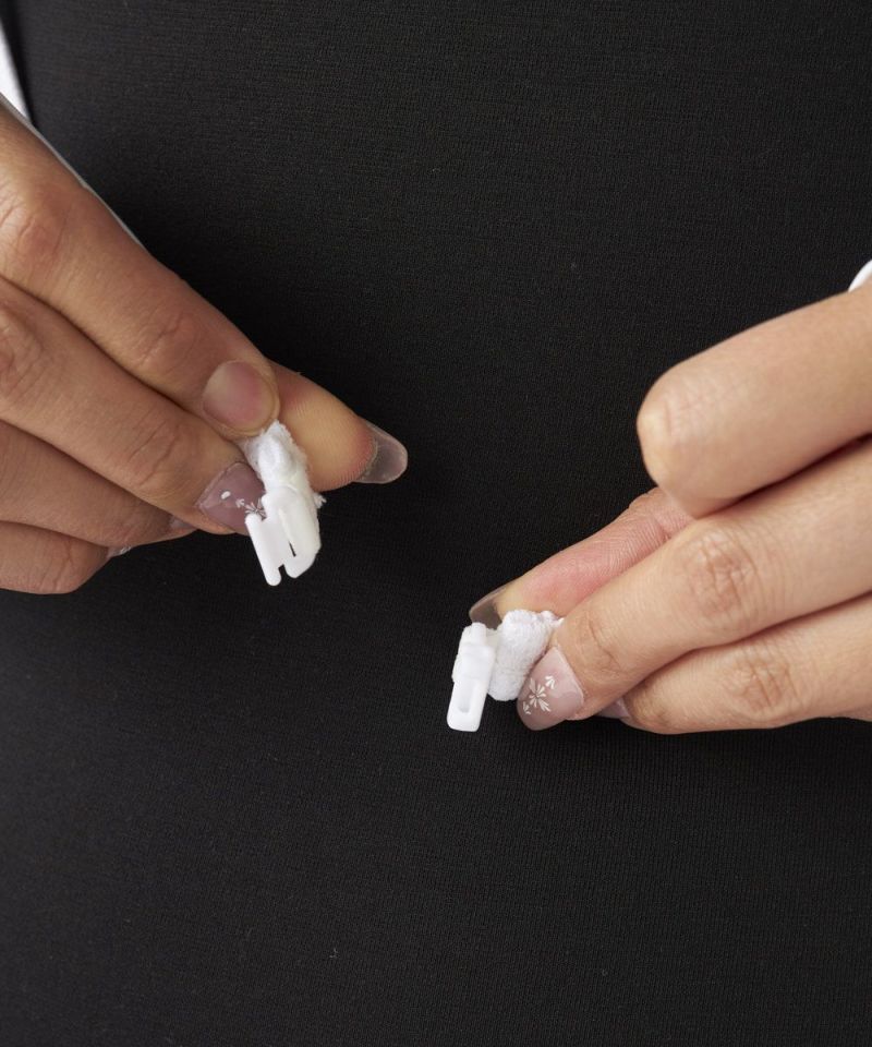 袖部分は接触冷感の機能糸を使用したベア天竺を採用。シャーリング加工を施し女性らしいディティールをプラ ス。グローブに重なる長さでしっかり日除けします。身頃のメッシュ素材は皮膚接着面積が少ない為汗をかいてもべとつかず蒸れを軽減します。