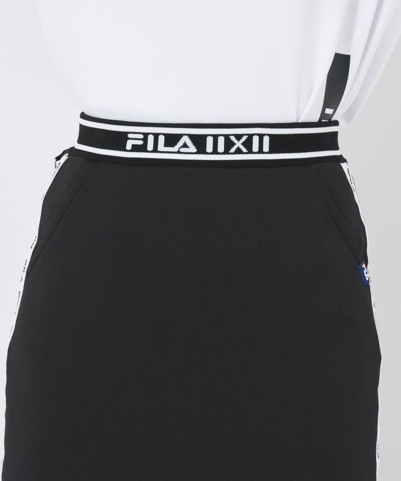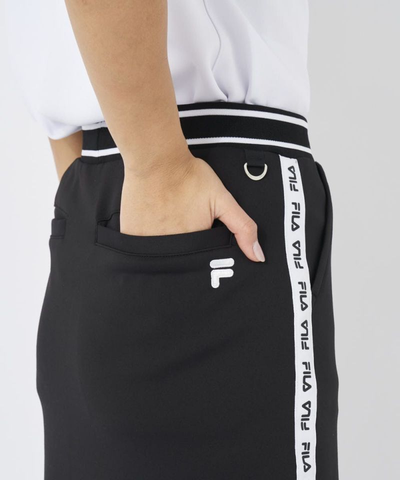 柔らかく軽いダンボールニットを使用したすっきりとしたタイトシルエットのスカート。ロゴテープとジャガードのウエストリブがデザインポイント。安心のインナーパンツセット。