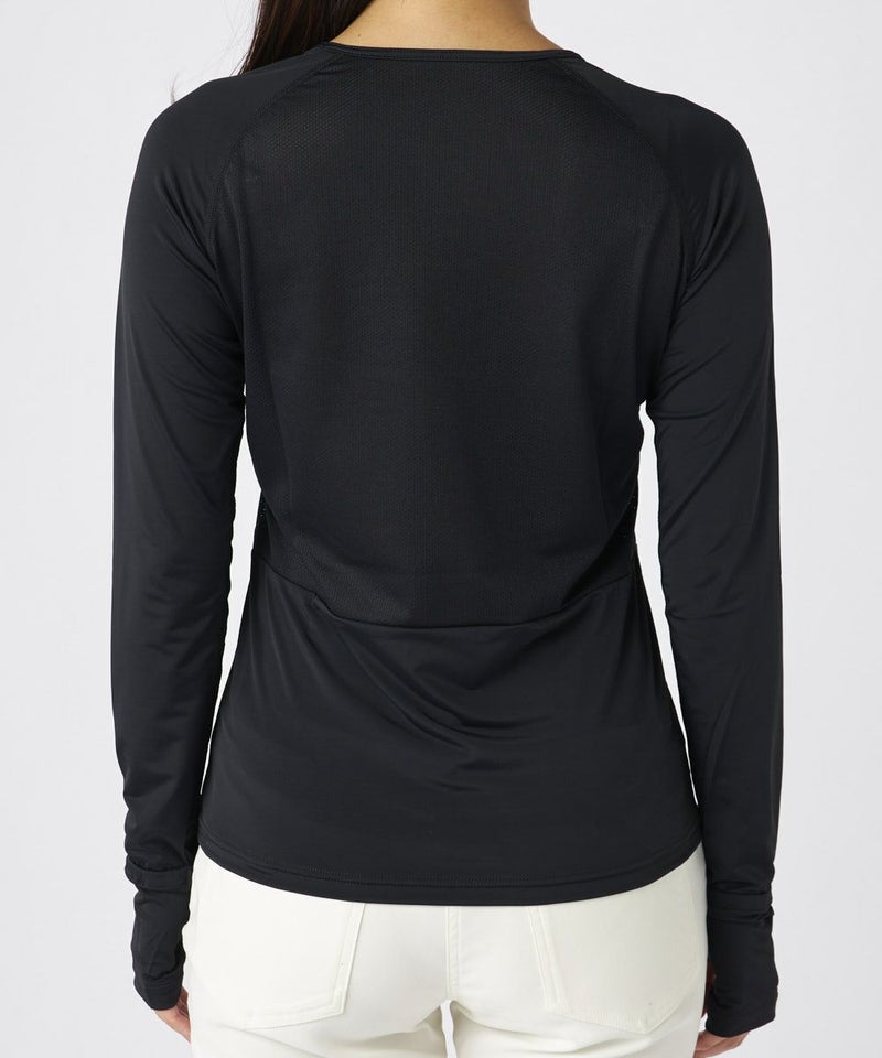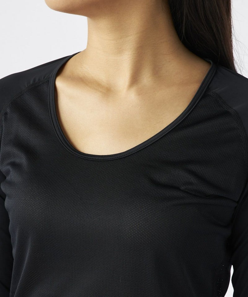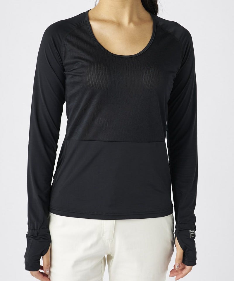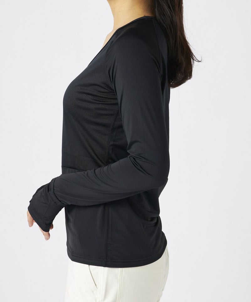 前身頃と背中部分にメッシュを使用した、インナーシャツ。手の甲まで隠れるデザインで、日焼け対策もばっちりです。