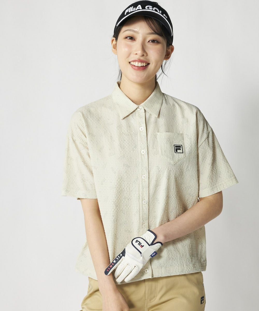 シアサッカー特有の清涼感あふれる表情に、さりげないロゴプリントをプラス。都会的なシャツデザインが、スポーティーすぎない洗練された大人のお洒落を演出します。同素材のボトムスとのセットアップも可能で、統一感のある着こなしを叶えます。