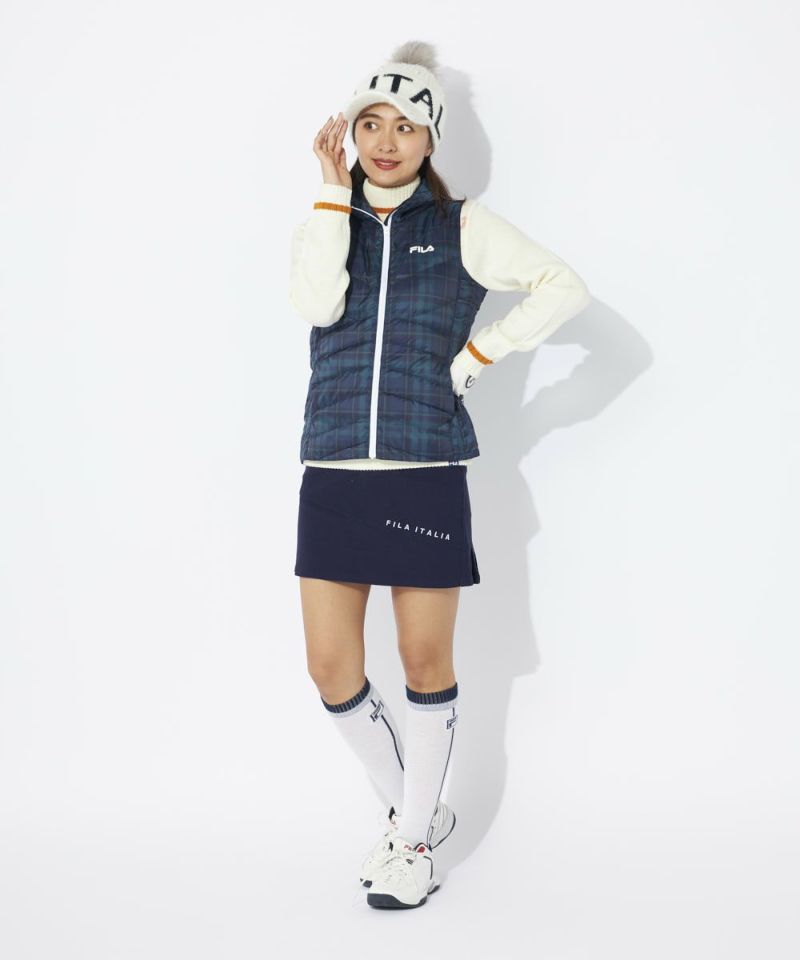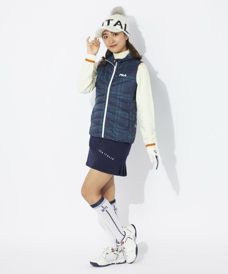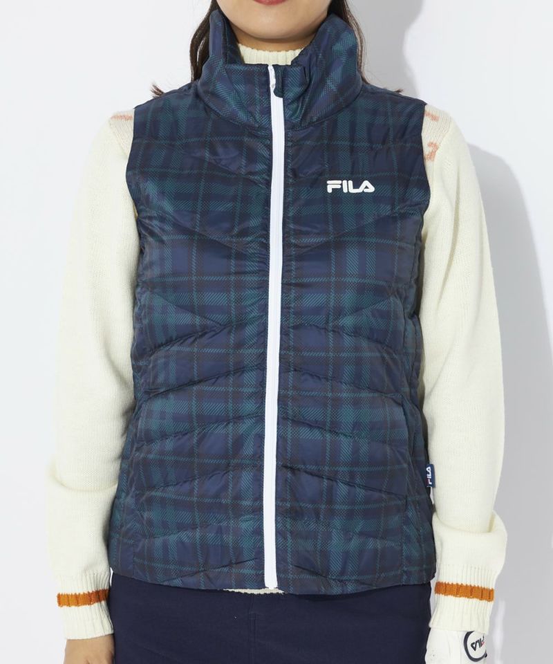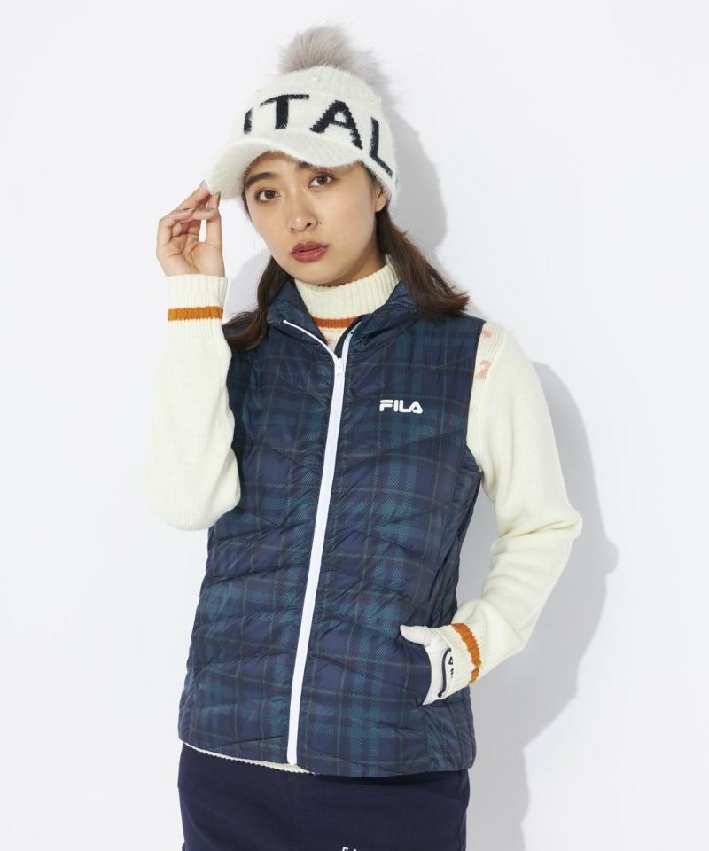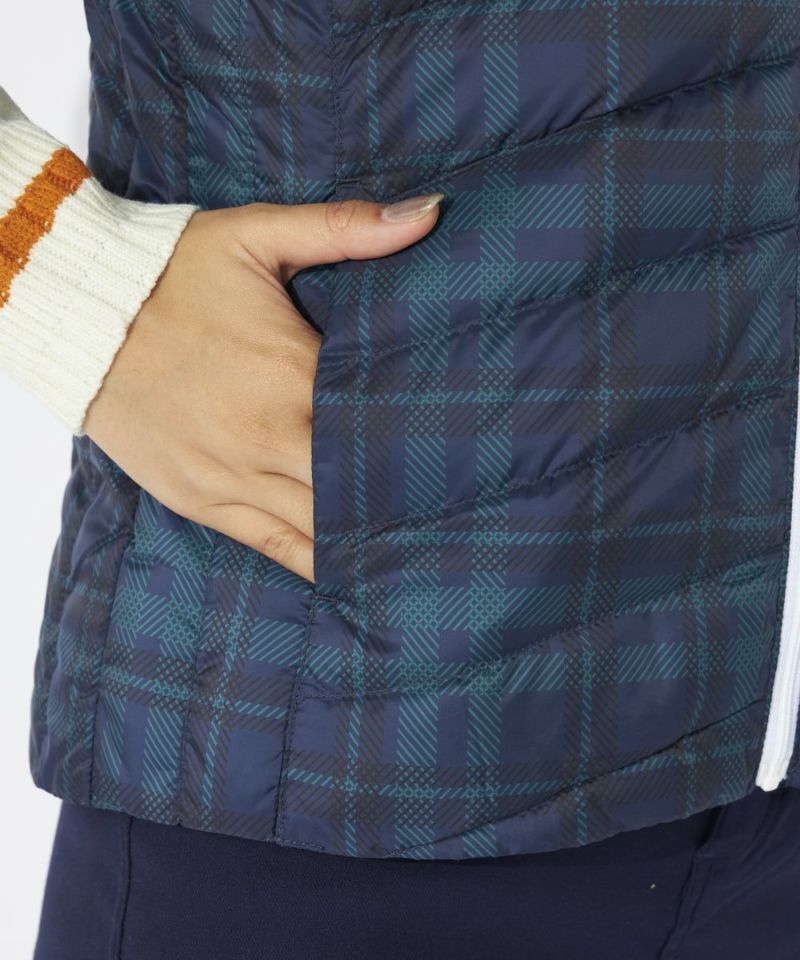 コーディネートのアクセントになるチェック柄の洗えるダウンベスト。天然ダウンと高機能ファイハーダウンを特殊な技法によりブレンドしたハイブリットダウンを使用。