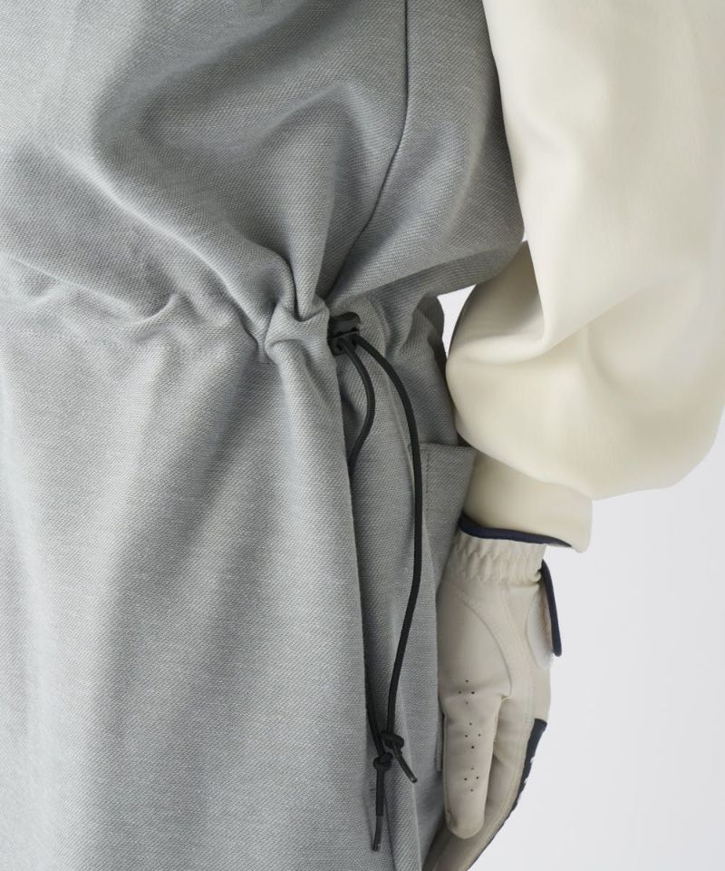 フーディーベストタイプのワンピースで、トレンド感とスポーティさを両立。程よく身体から離れるゆったりシルエットは、スイングしやすく、スタイルアップ効果も演出します。ウエストには調整コードが付いており、好みに合わせてブラウジングすることで、さらに着こなしの変化が楽しめます。