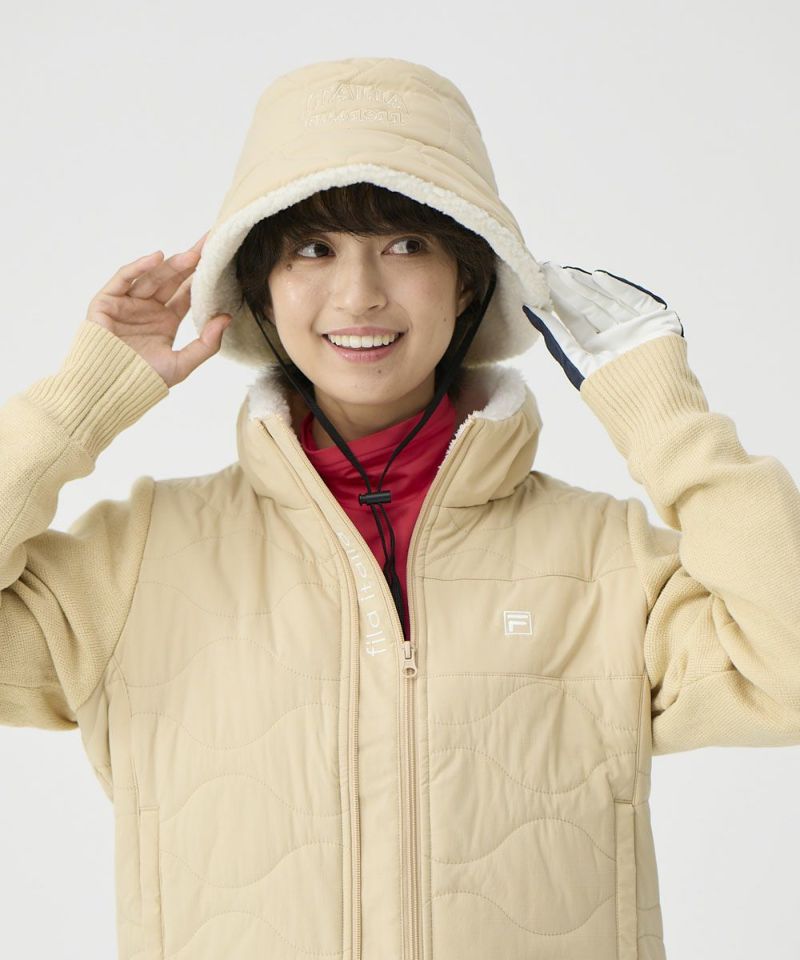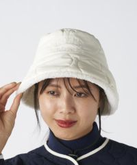 薄中綿キルトのバケットハット。ウェアとお揃いのキルト柄です。帽体裏地にフリース素材を使用したあたたか仕様になっています。風対策として、取り外し式のあごひもがついています。