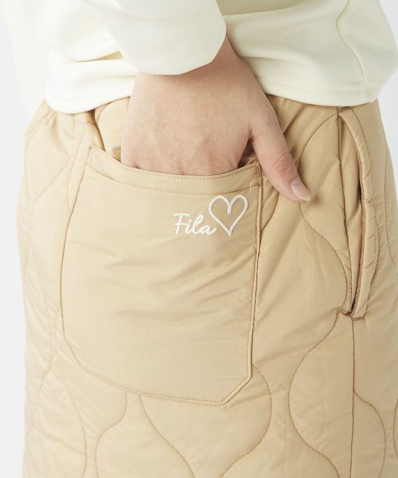 前面左裾のメーカーロゴ刺繍や背面右上部のFILA文字とハート柄の刺繍がデザインのアクセントになっています。