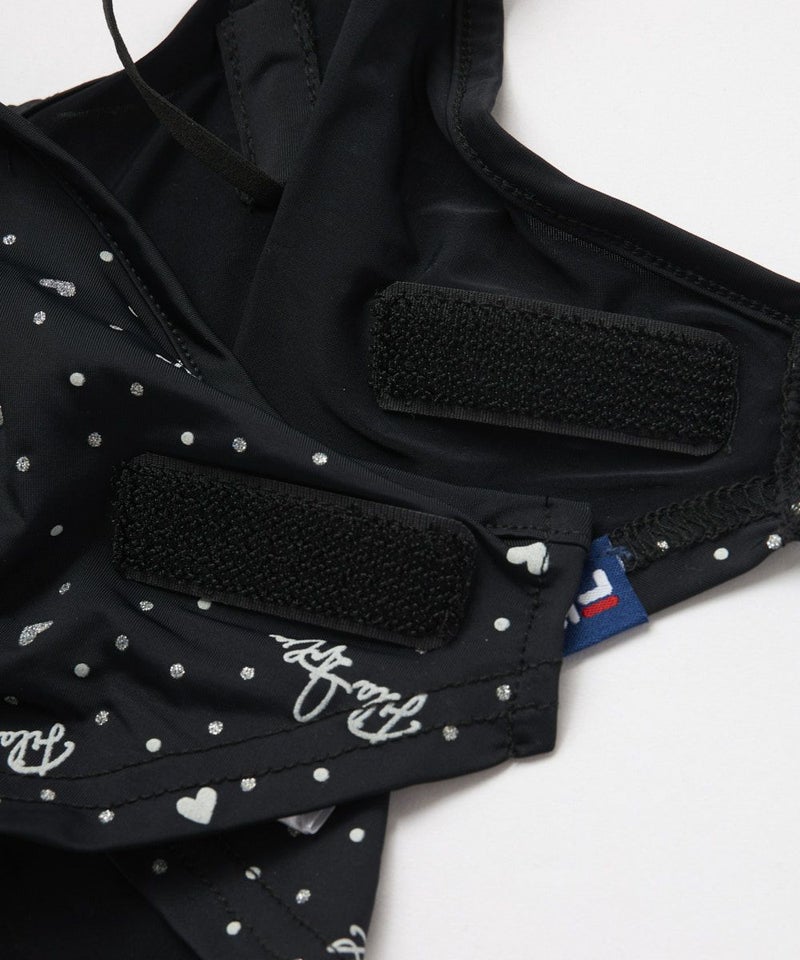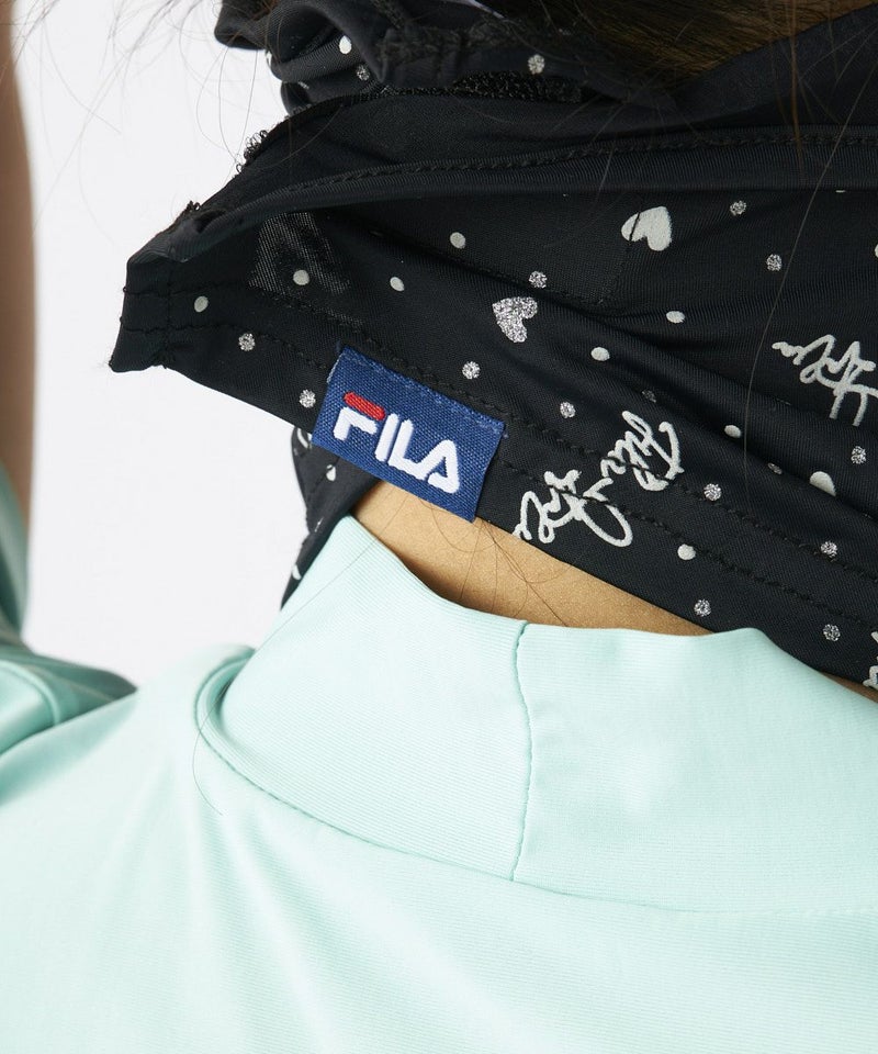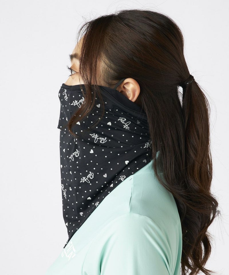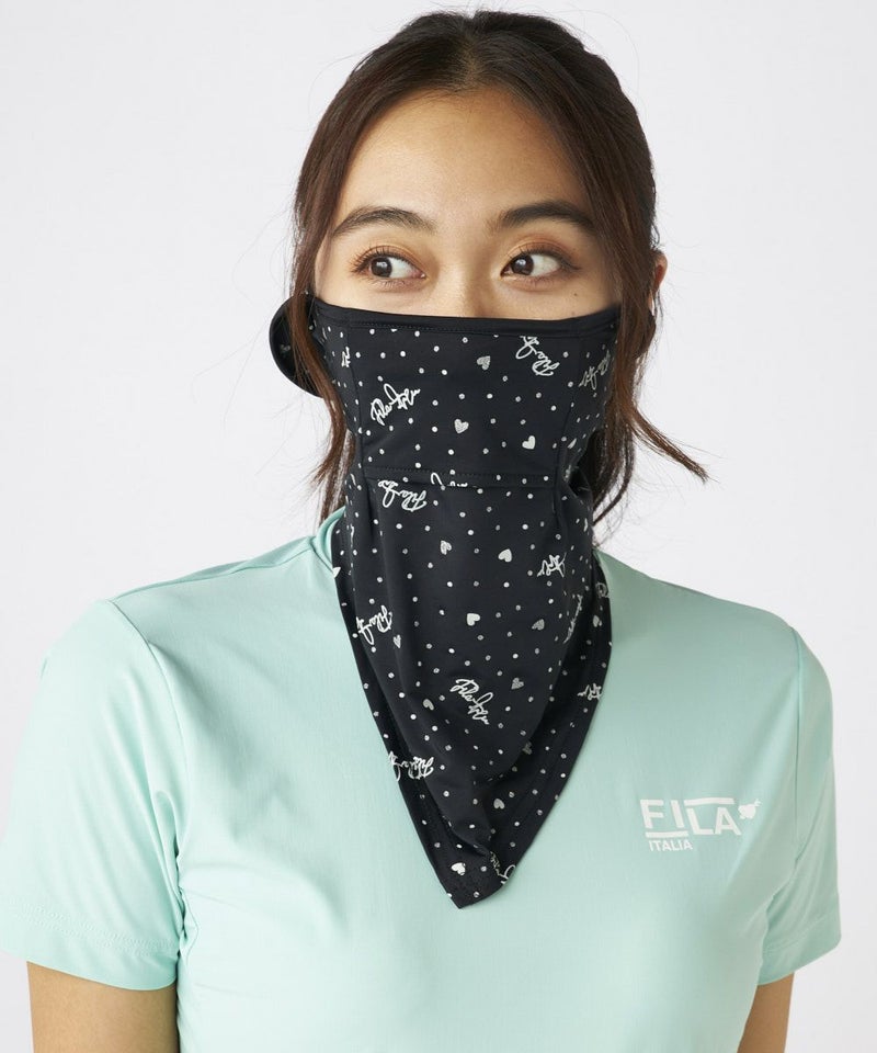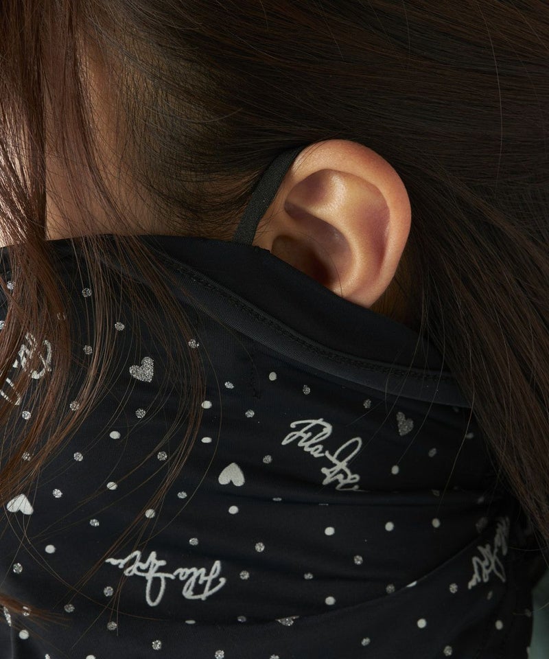 鼻下部分に通気口のあるフェイスマスク。接触冷感の機能糸を使用したベア天竺にグリッタープリントで飛び柄を施した素材を採用。耳までカバーします。