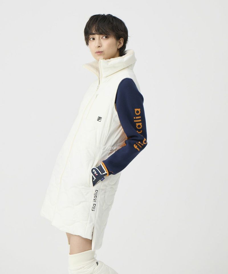 柔らかなキルト加工が上品な印象を演出し、衿元のボアが優しく可愛らしいアクセントを添えます。フルジップ仕様で着脱もスムーズ。ウエストは内側のスピンドルで調整可能なため、好みのシルエットでスタイルアップ効果も期待できます。
