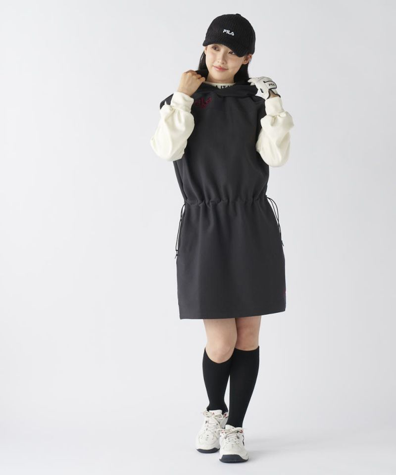 ツイルのようなカジュアル感のあるストレッチジャージのワンピースフーディーベスト。ゆったりシルエットでスイングしやすいのもゴルフに最適です!