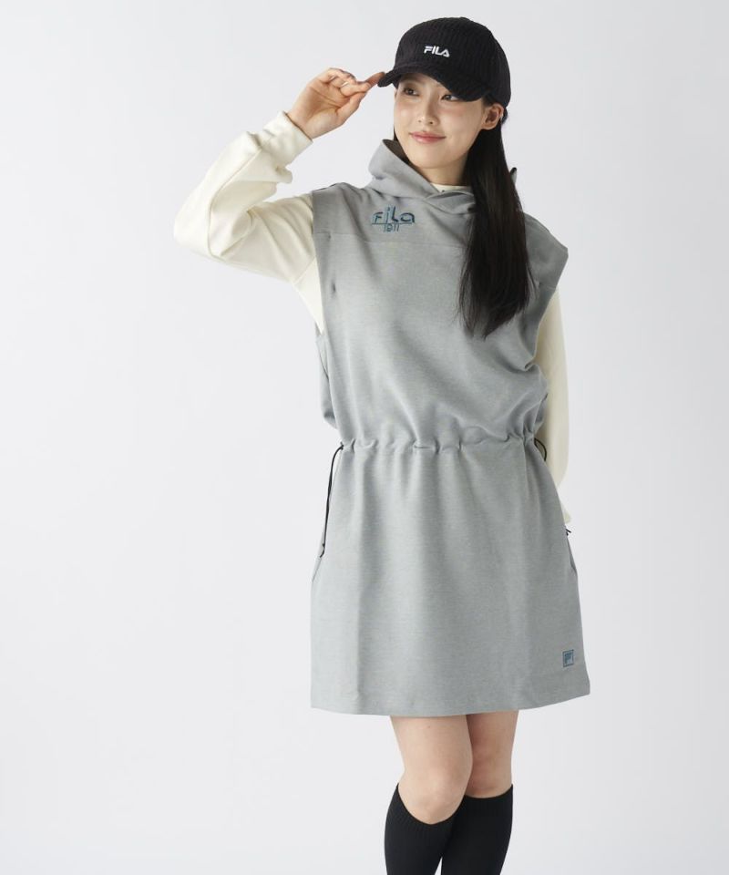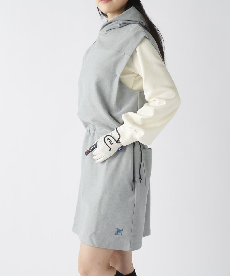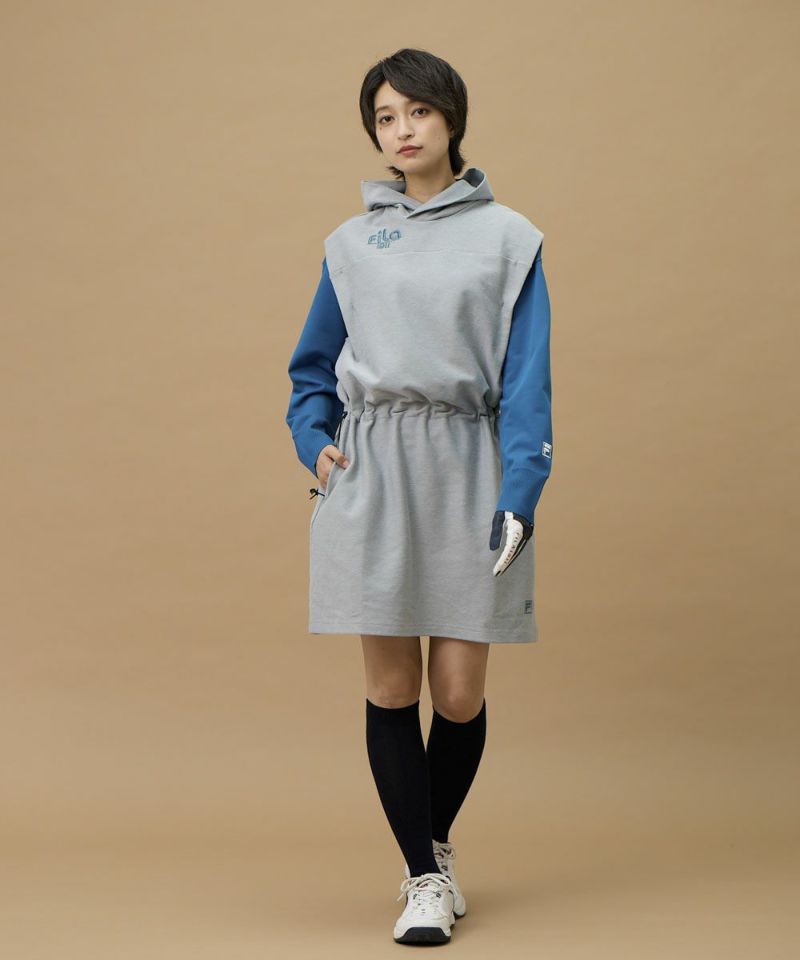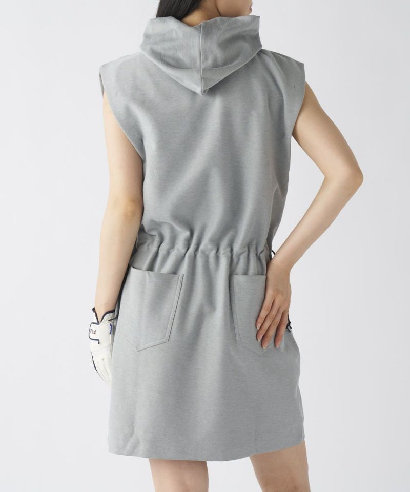 フーディーベストタイプのワンピースで、トレンド感とスポーティさを両立。程よく身体から離れるゆったりシルエットは、スイングしやすく、スタイルアップ効果も演出します。ウエストには調整コードが付いており、好みに合わせてブラウジングすることで、さらに着こなしの変化が楽しめます。