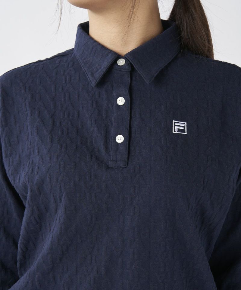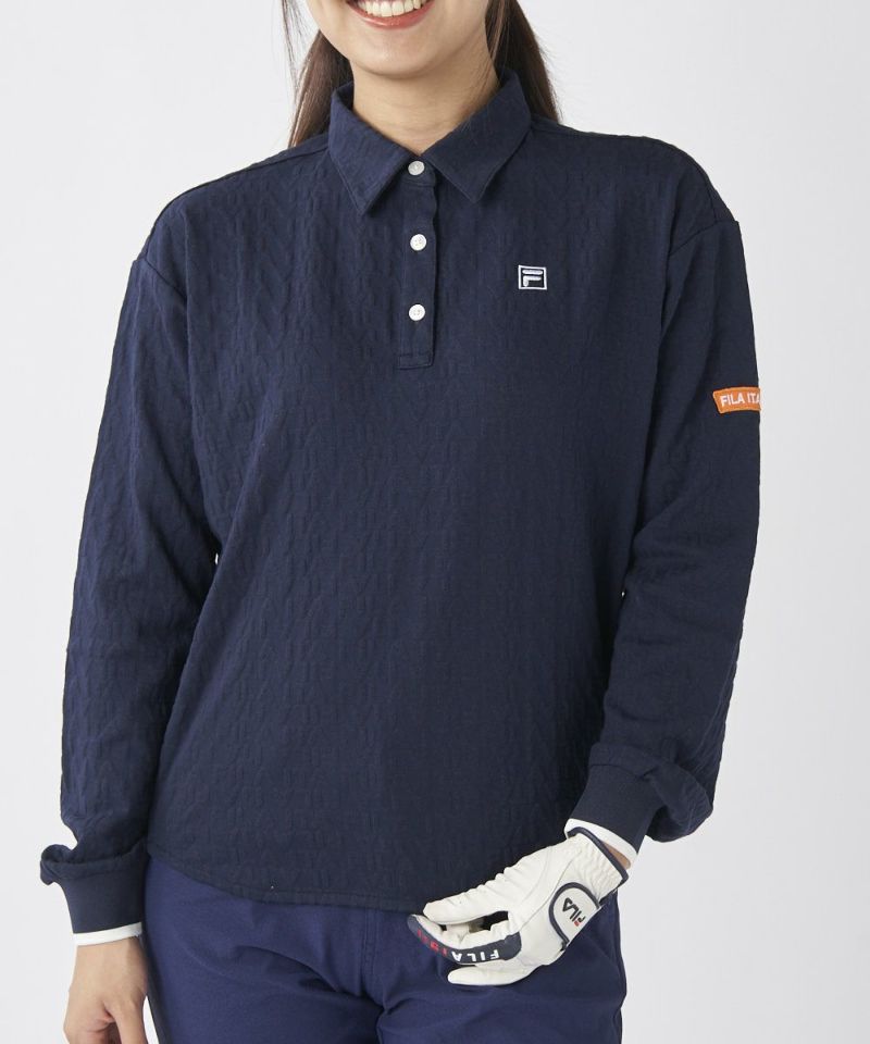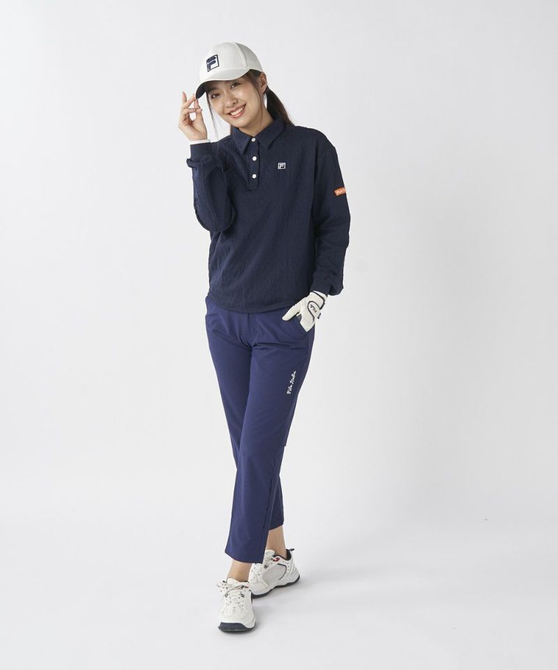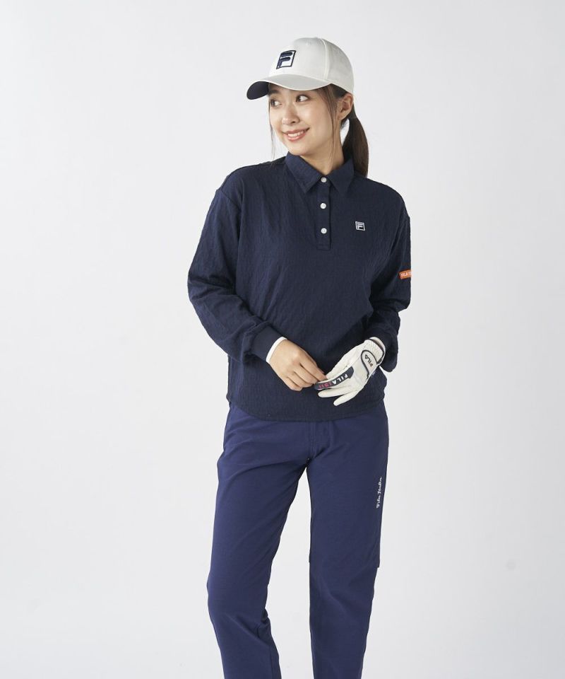 編地で表現されたロゴ柄が、シンプルになりすぎず、おしゃれなアクセントをプラスします。後ろ裾のギャザーデザインがシルエットに女性らしい丸みを加え、緩やかなラウンドヘムが柔らかな印象を演出。袖口のリブデザインもスポーティなポイントとなり、大人のクリーンなゴルフスタイルを完成させます。