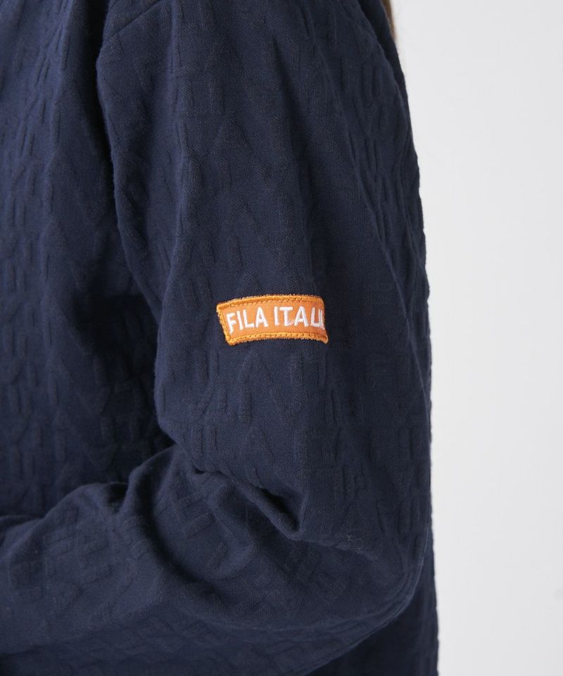 凹凸感のある3Dジャカード素材を使用し、ポコポコとした編地変化でロゴ柄を表現。無地よりも表情豊かで上品な質感を持ちます。UVカット機能も備えているため、強い日差しから肌を守り、秋の始まりから快適に着用できる機能的な素材です。