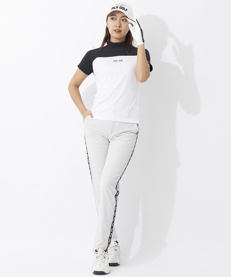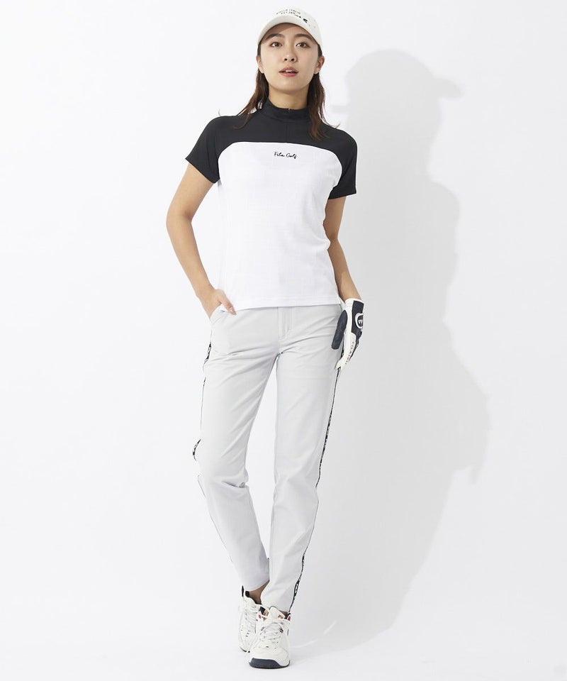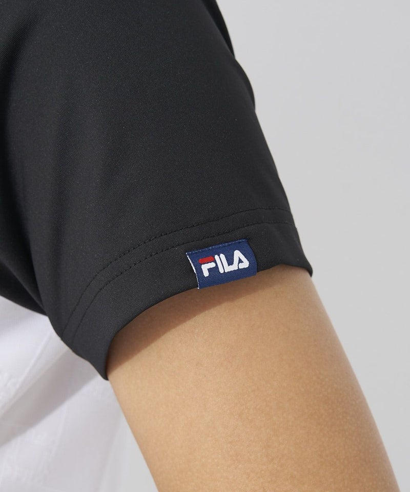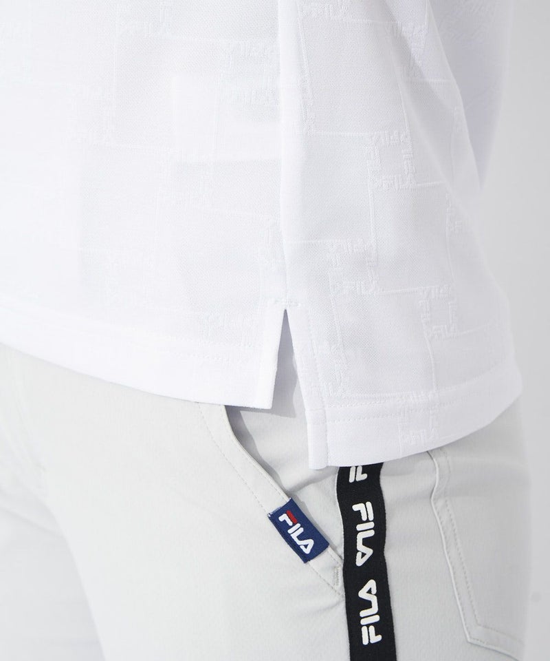 動きやすい変形ラグランスリーブシャツ。脇線を前側に寄せることで、細見せ効果を持たせました。FILAロゴをジャガードで表現したストレッチ性の良い素材を採用。