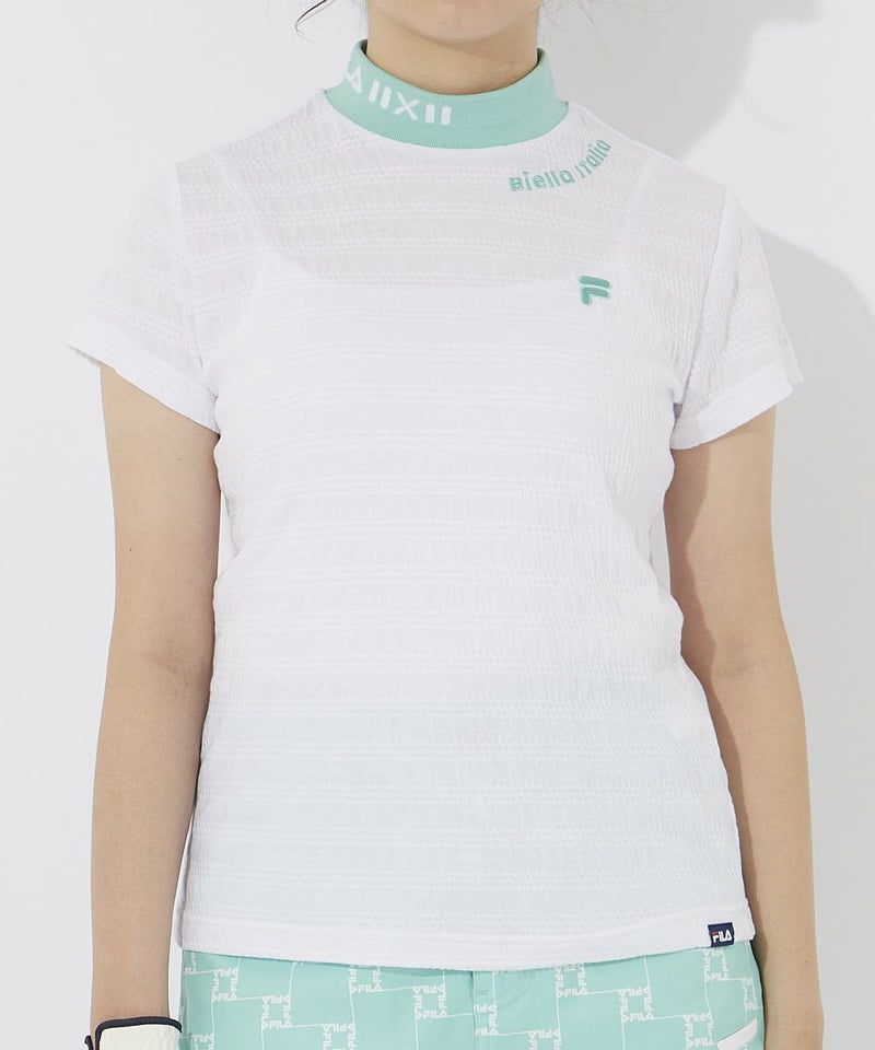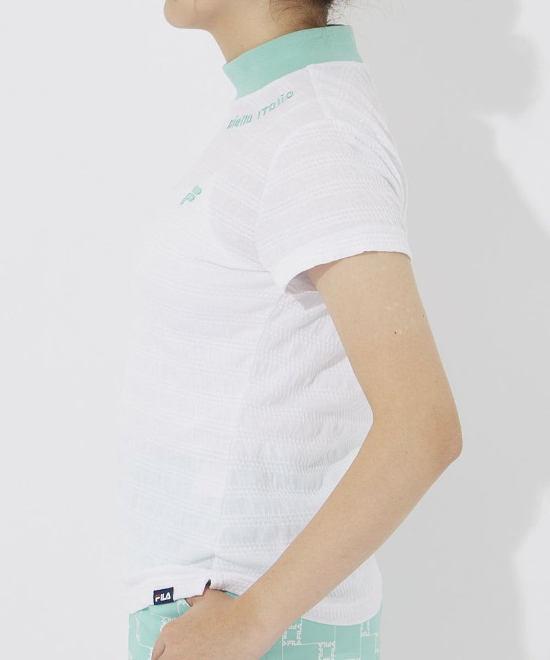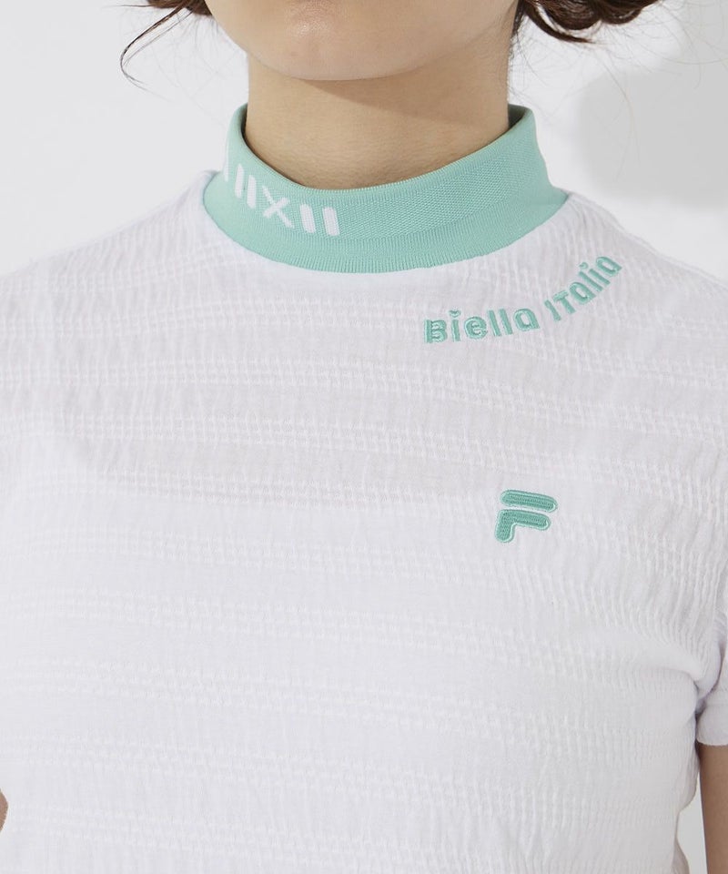 ジャガードでグラフィックを表現したリブ衿が特徴のモックネックシャツ。杢調の、シャーリングがかかった特徴的な素材を採用。