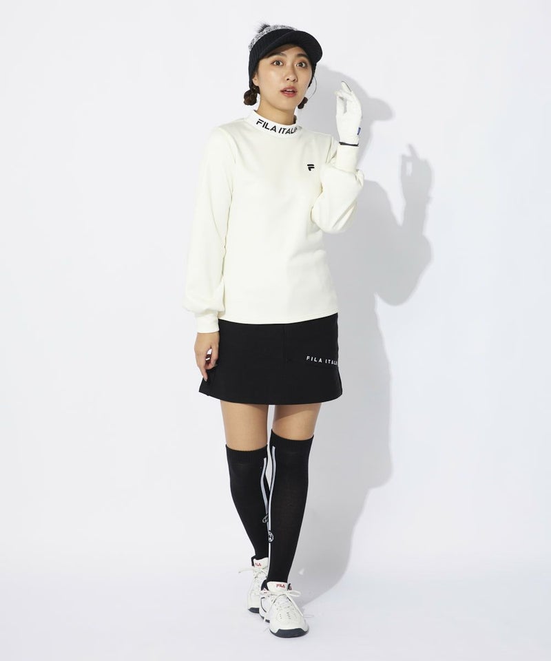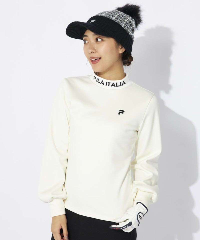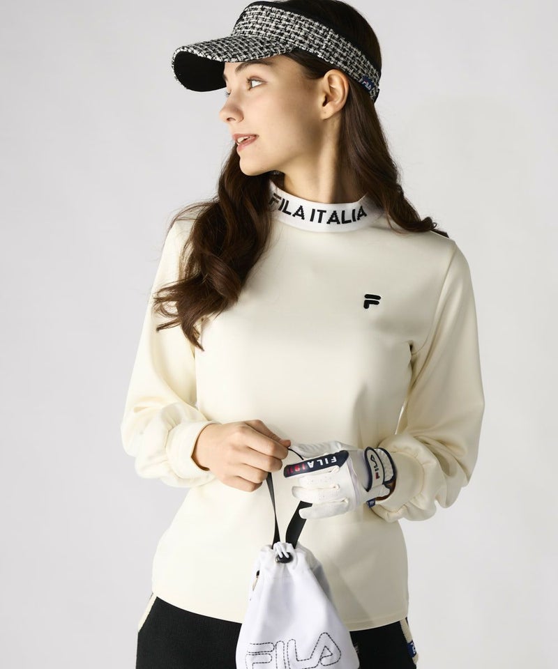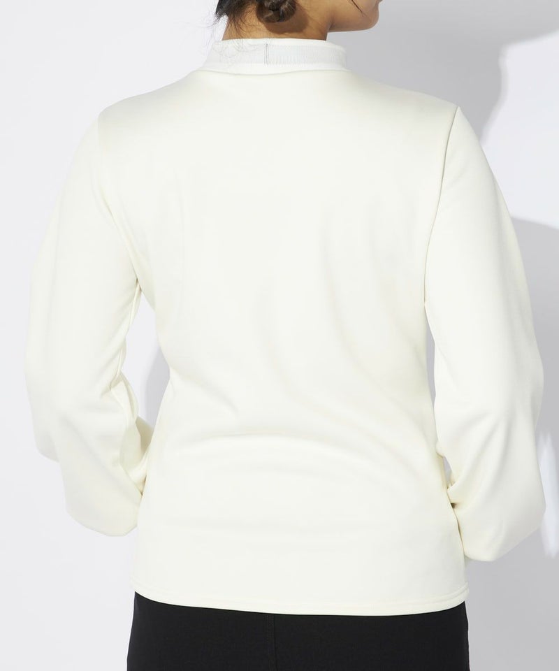 ジャガードのリブ衿がポイントのモックネックシャツ。袖口をふんわりさせたフェミニンなデザイン。裏面がベロア調の柔らかく肌触りの良いストレッチ素材を使用。袖口のボリュームは程よいボリューム感なので、インナーとしてもご利用いただけます。