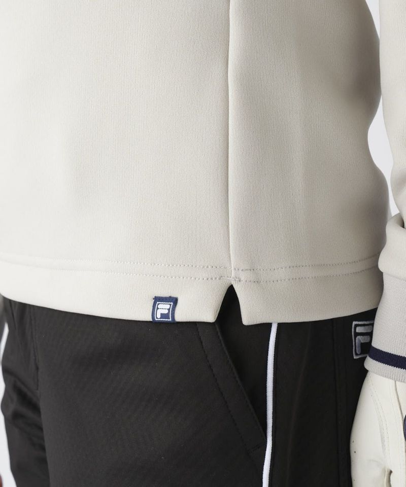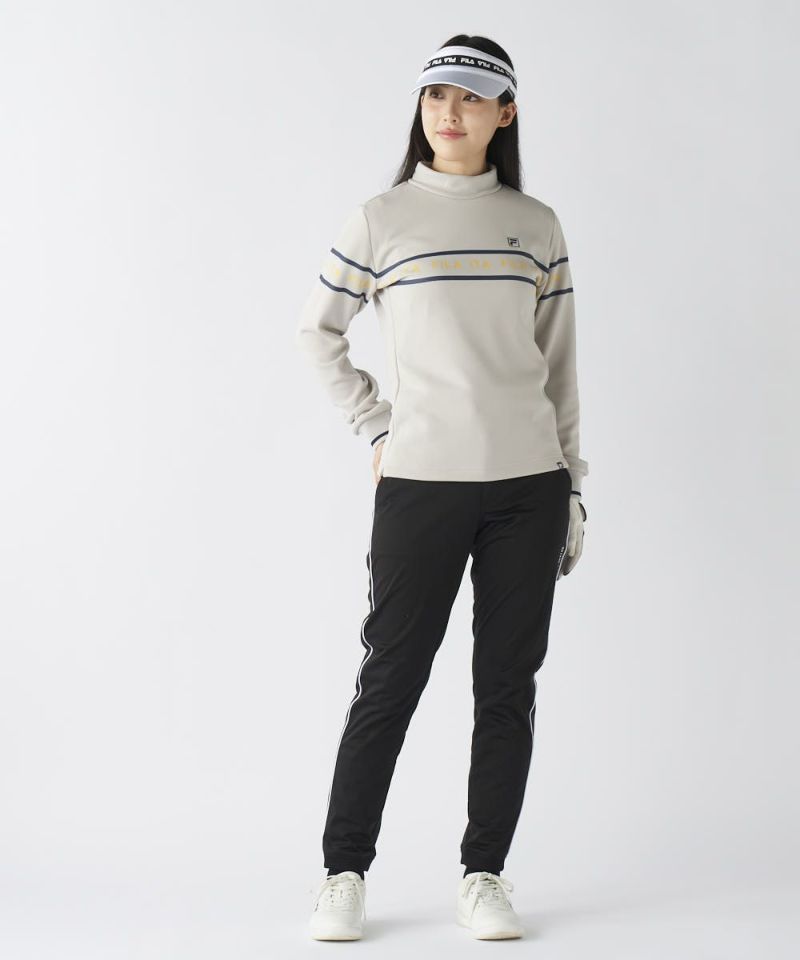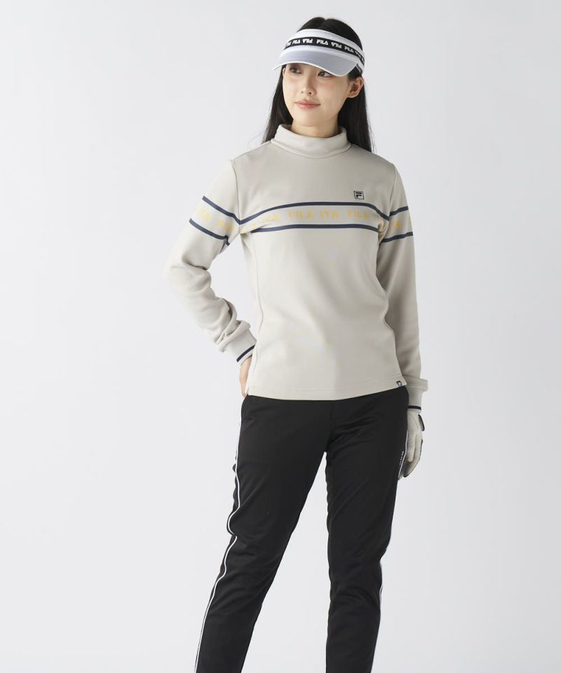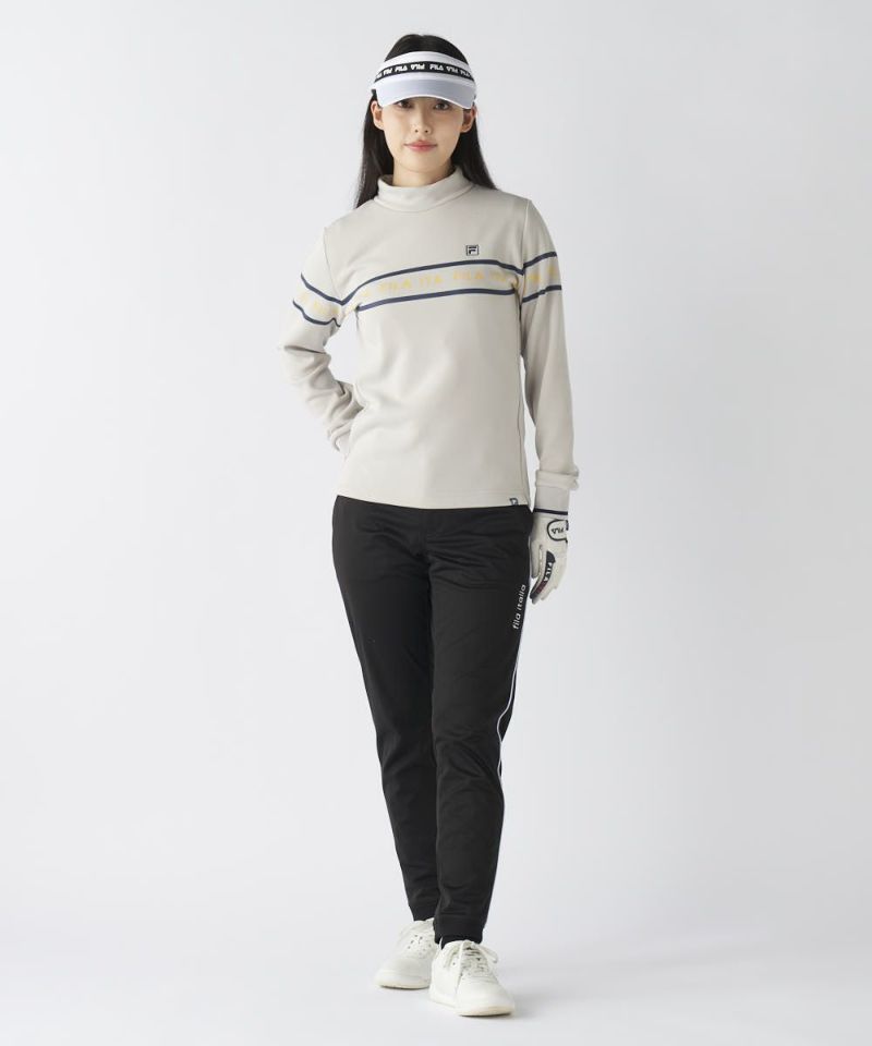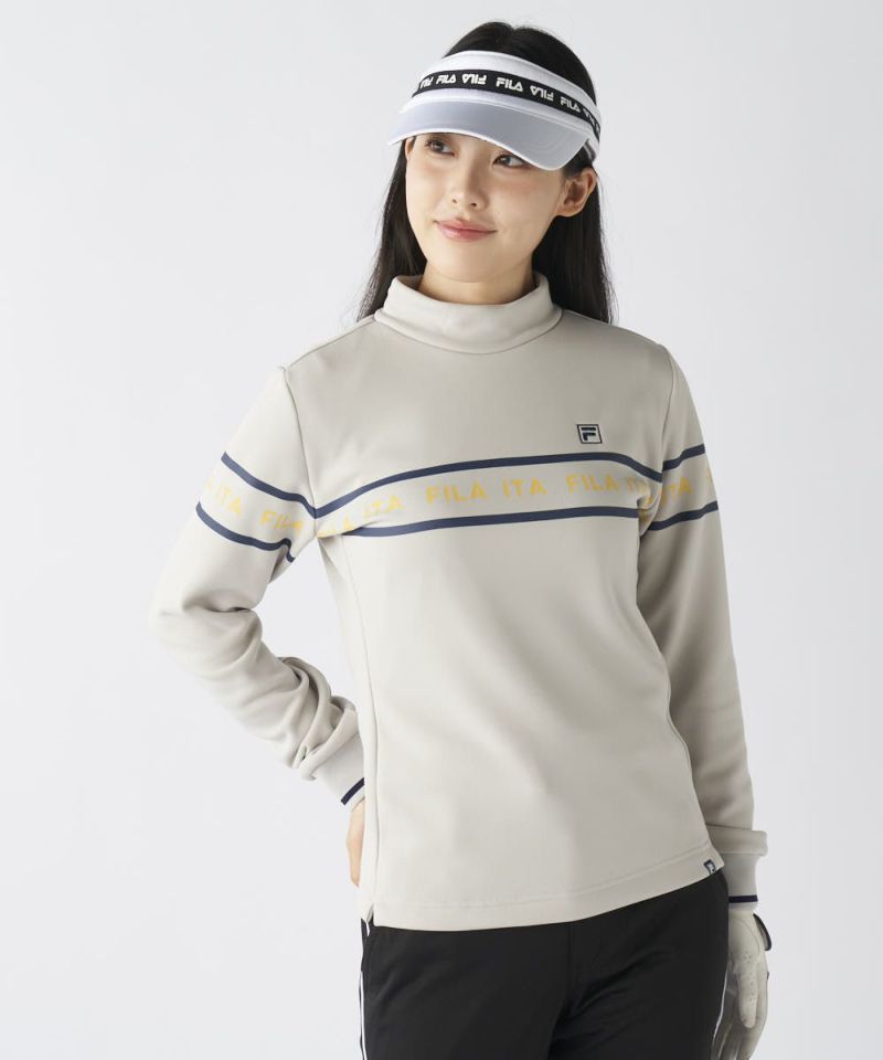 モックネックと袖口のリブ仕様がスポーティで洗練された印象を与えます。フロントの配色ライン使いのロゴプリントが、程よいアクセントとなり、ベストやブルゾンとのレイヤードもスマートに決まります。シンプルかつ機能的で、大人の女性のクリーンなゴルフスタイルに欠かせないベーシックアイテムです。