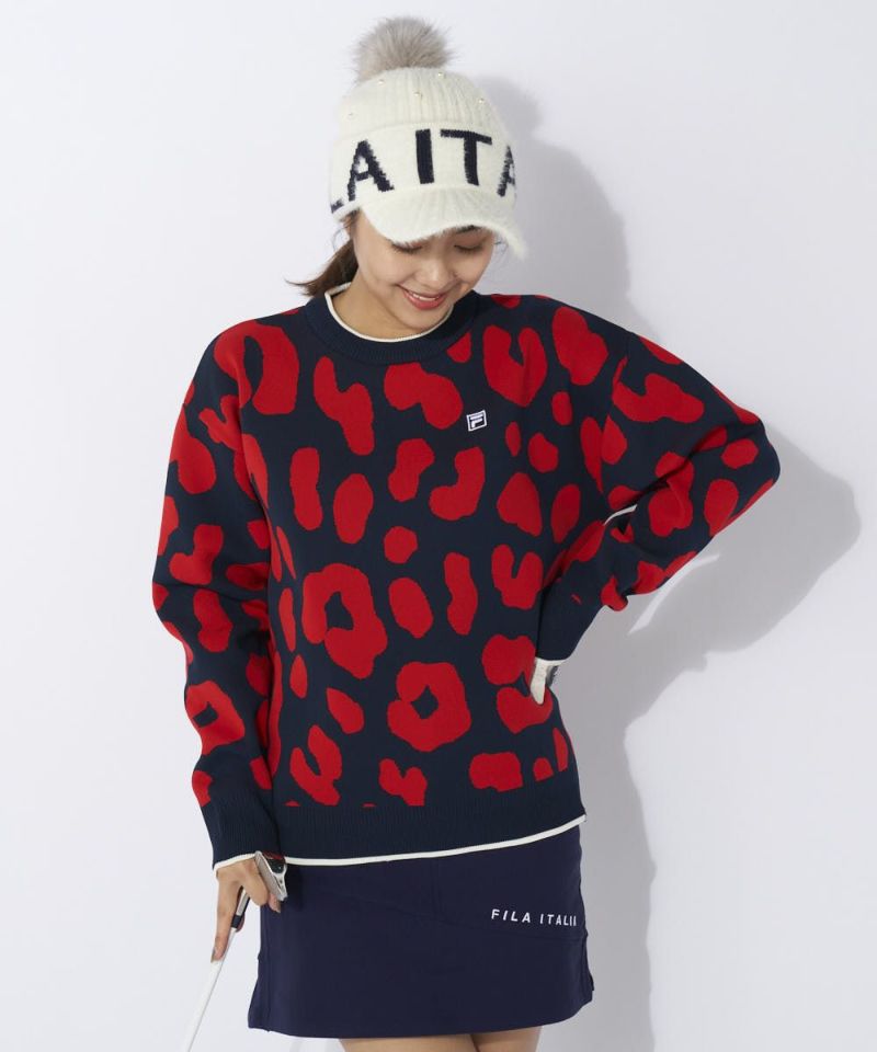カラーによって柄が違う、選べる柄セーター。ポロ衿はもちろんモックネックシャツとも相性がいいクルーネ ックデザインです。