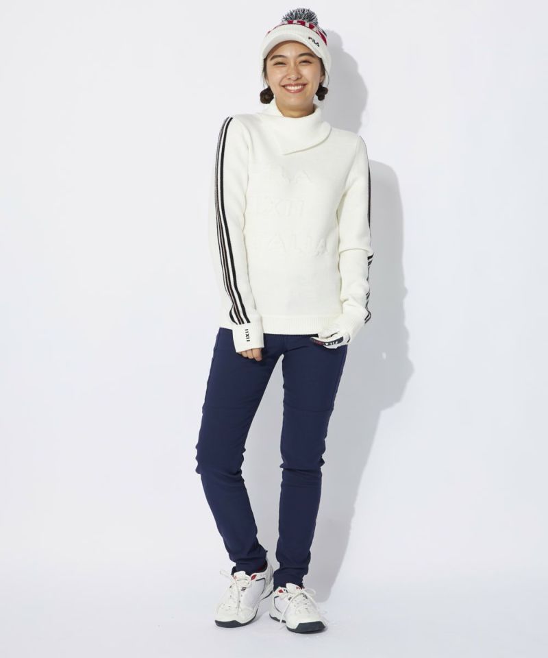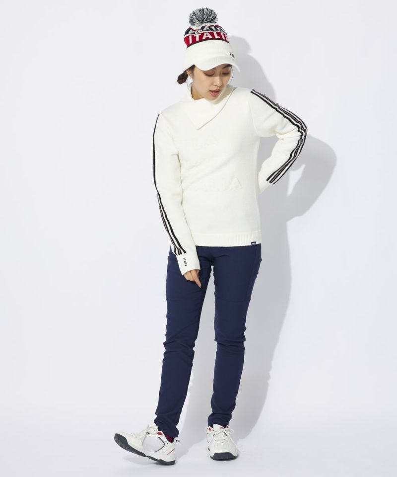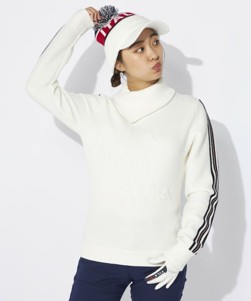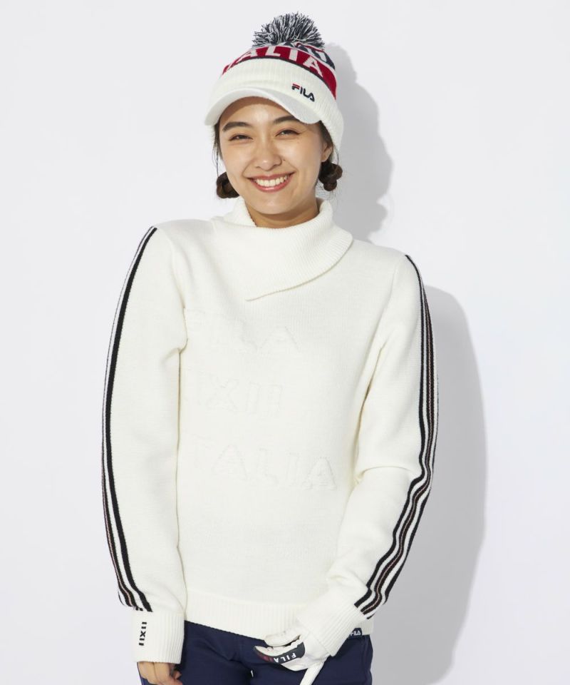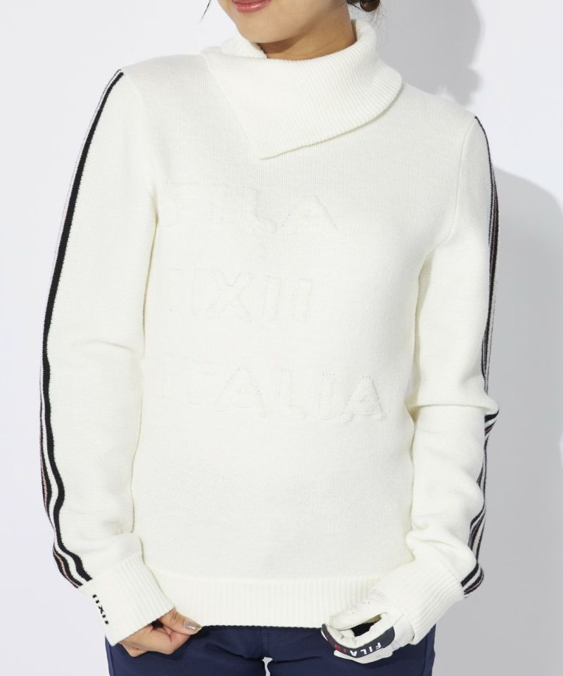 変形ショールカラーが特徴的なセーター。立体感のあるパイルジャガードでグラフィックを表現。
