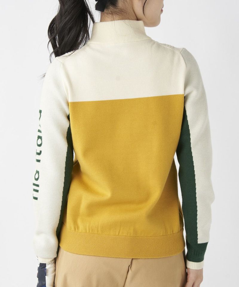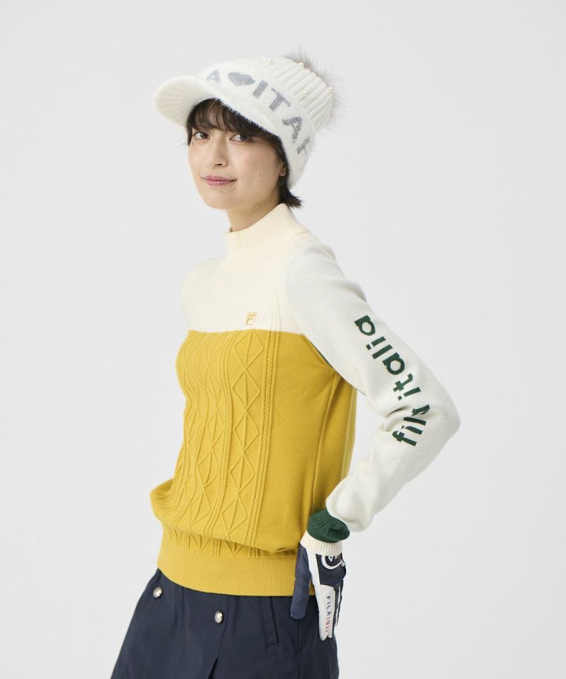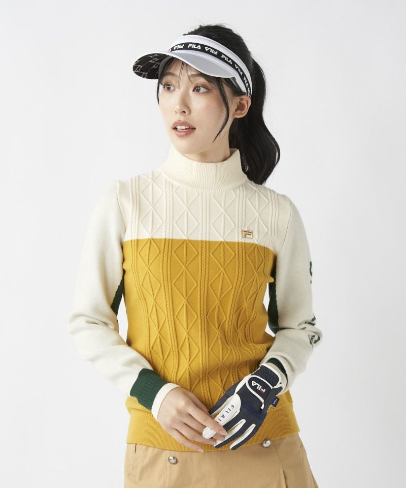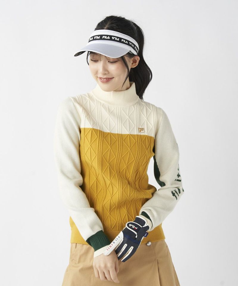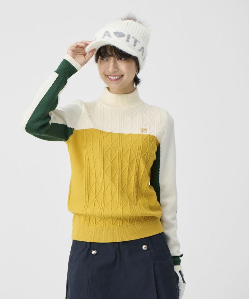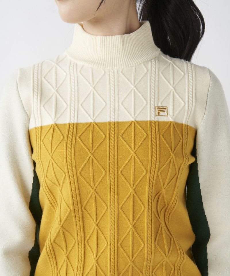 スポーティな切り替え配色とケーブル編みデザインが特徴のゴルフ長袖ニットです。
