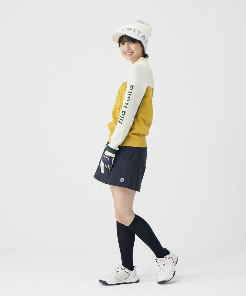ネイビー、ブラック、イエローの3色展開で、機能性とデザイン性を兼ね備えた一枚です。ピリングが起こりにくい抗ピリングアクリル素材を使用しています。